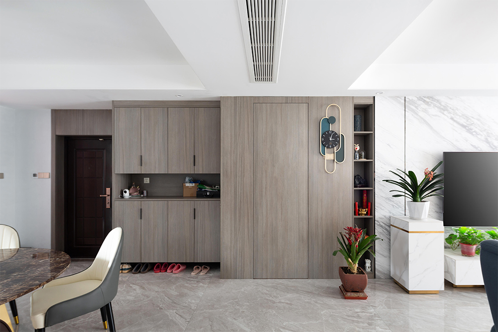 從玄關(guān)處進(jìn)門(mén),可以看到在平行于玄關(guān)的一邊處做了整面式的柜子,采用整柜到頂?shù)姆绞剑蚁鹉旧墓耖T(mén)與大理石紋路的地磚,在顏色上遙相呼應(yīng),形成了一種高雅靜謐的感覺(jué)。