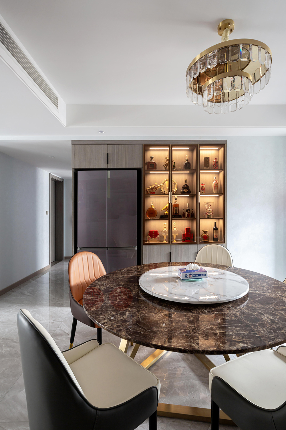 廊道右側(cè)便是餐廳所在區(qū)域,地板與餐桌表面都采用大理石紋路的磚面,顯得典雅又輕奢。后方做了一整面的酒柜與墻面相連。左側(cè)在酒柜旁做了冰箱柜,嵌入式冰箱放置節(jié)省了占地空間,整面式的做法有一種舒適的視覺(jué)感。