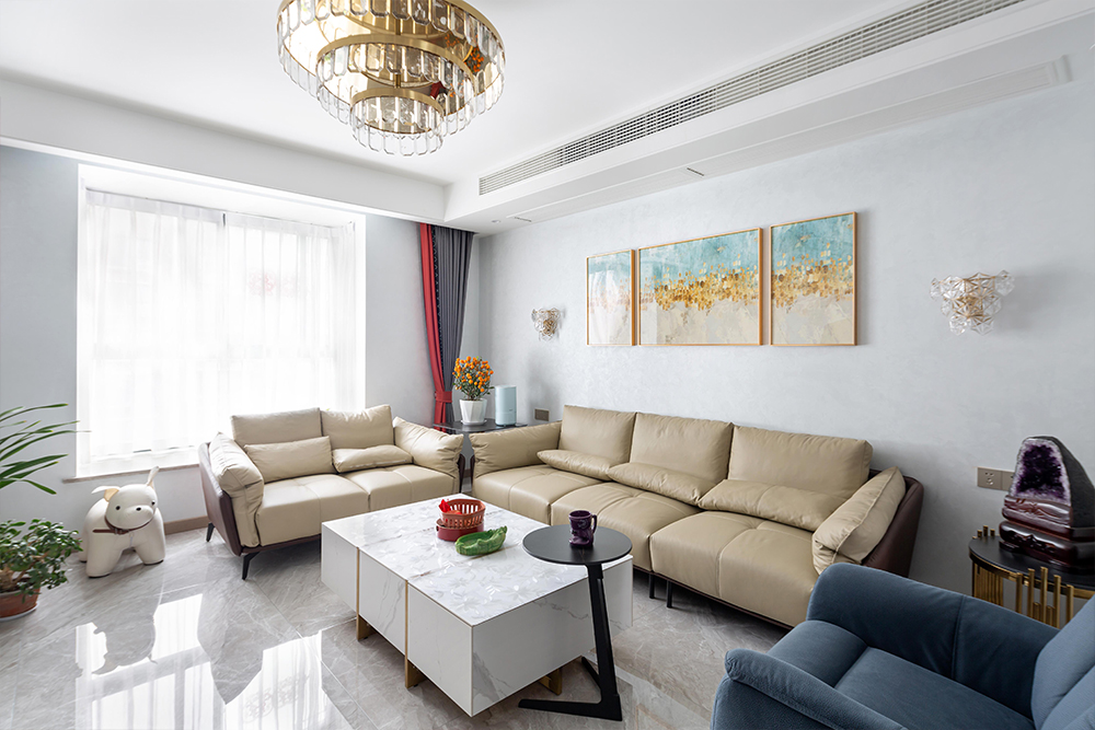 從客廳處映入眼簾的便是郁郁蔥蔥的綠植,體現(xiàn)出屋主對(duì)于生活認(rèn)真的態(tài)度。客廳的墻面板采用白色大理石紋路,墻面的裝飾畫(huà)給整個(gè)空間增添了美感。