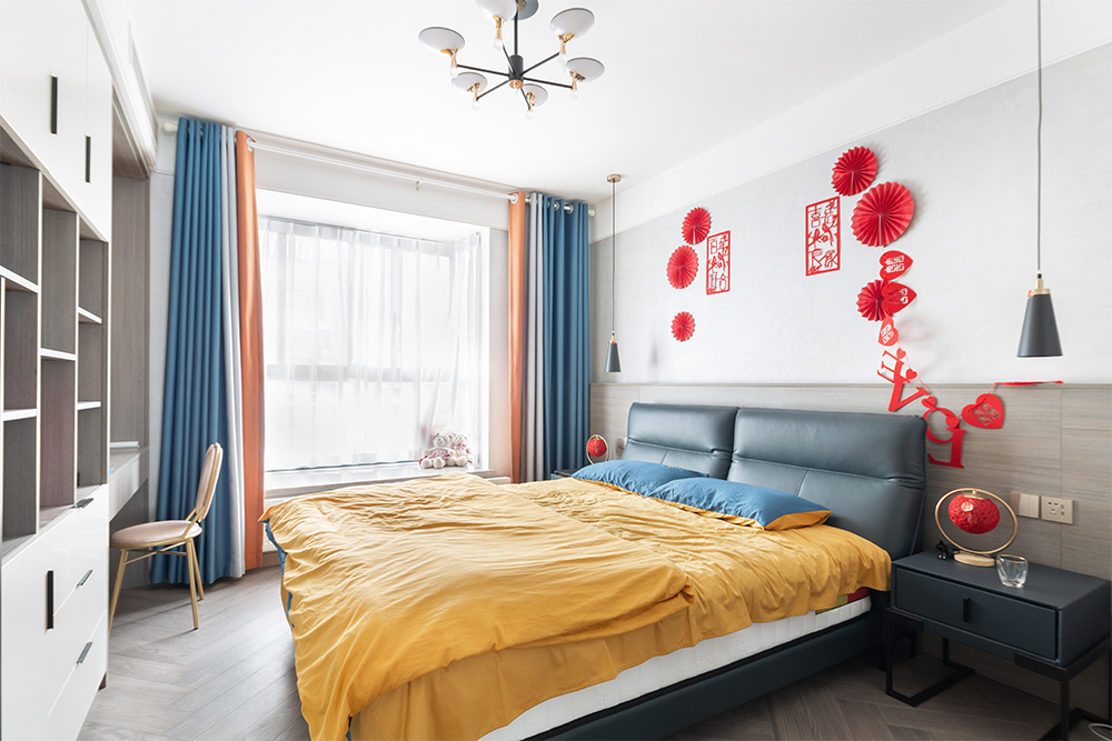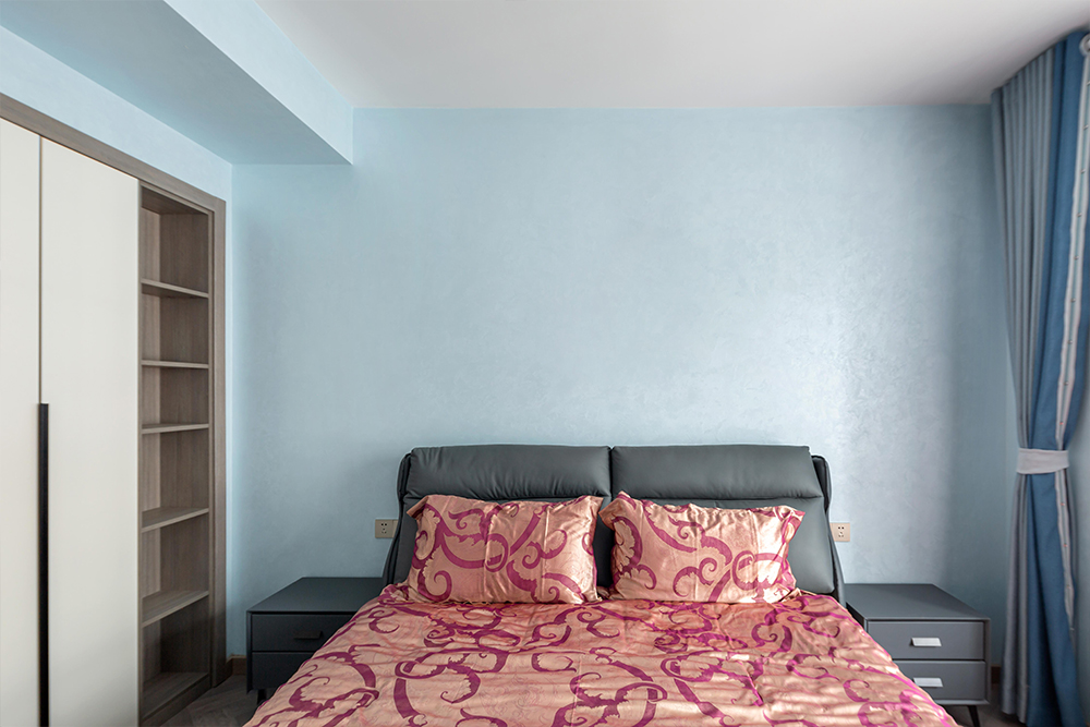 用藍(lán)色墻布覆蓋在墻面,對(duì)墻面起到很好的保護(hù)作用。次臥最大的亮點(diǎn)在于房間內(nèi)設(shè)計(jì)了一個(gè)隱藏的衣帽間,在柜子內(nèi)做出了U形的布局,將內(nèi)部空間分層,可以放置衣物和棉被??臻g內(nèi)部既不會(huì)顯得突兀,關(guān)上柜門(mén)之后內(nèi)部空間更加完整。