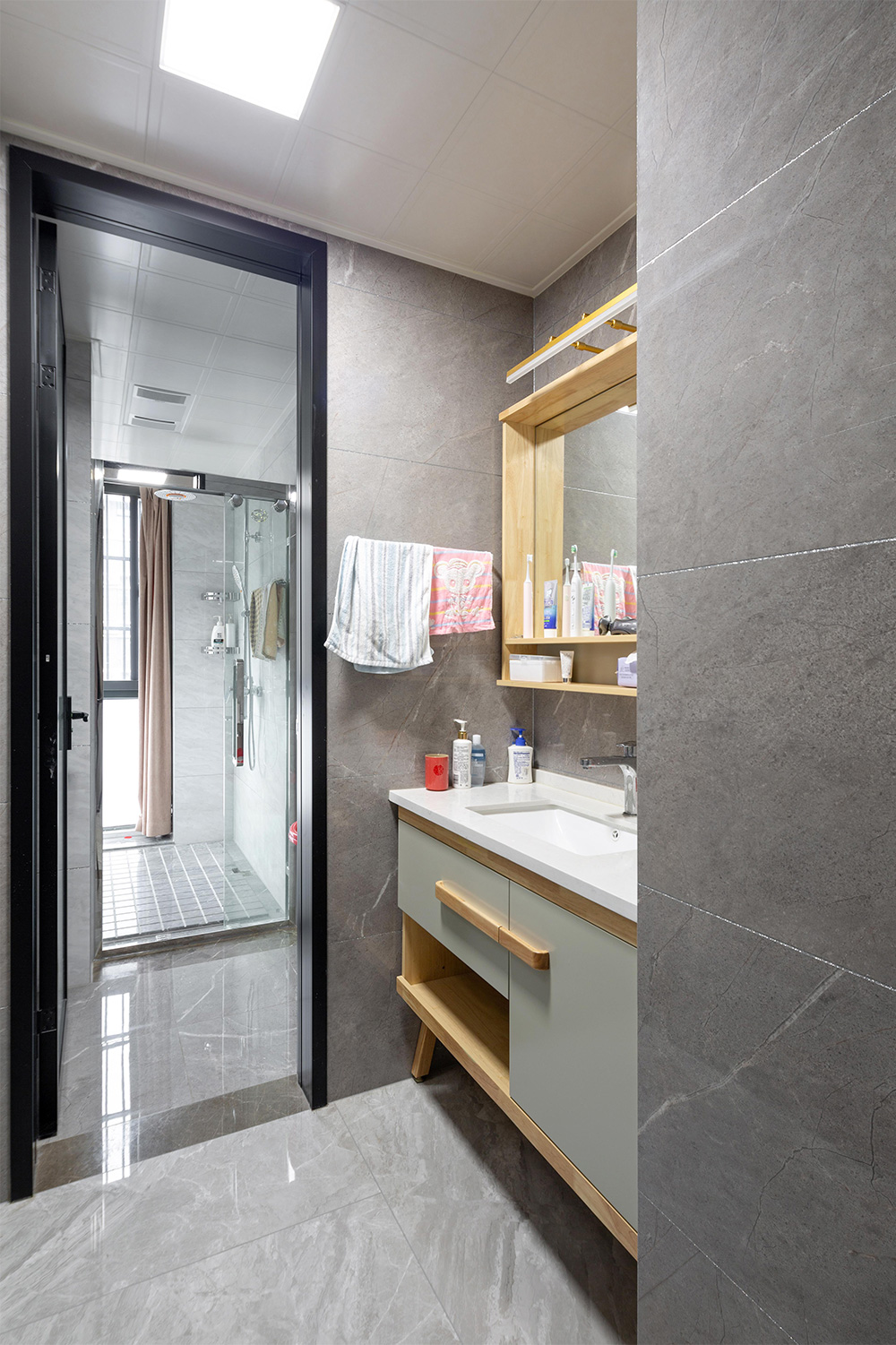 衛(wèi)生間延續(xù)了整間房屋的風(fēng)格,采用原木風(fēng)的設(shè)計(jì),明亮的燈光顯得柜子光澤更加透亮。在柜子底部留出空間便于濕氣的蒸發(fā),徑直延伸的空間方便做干濕處理。