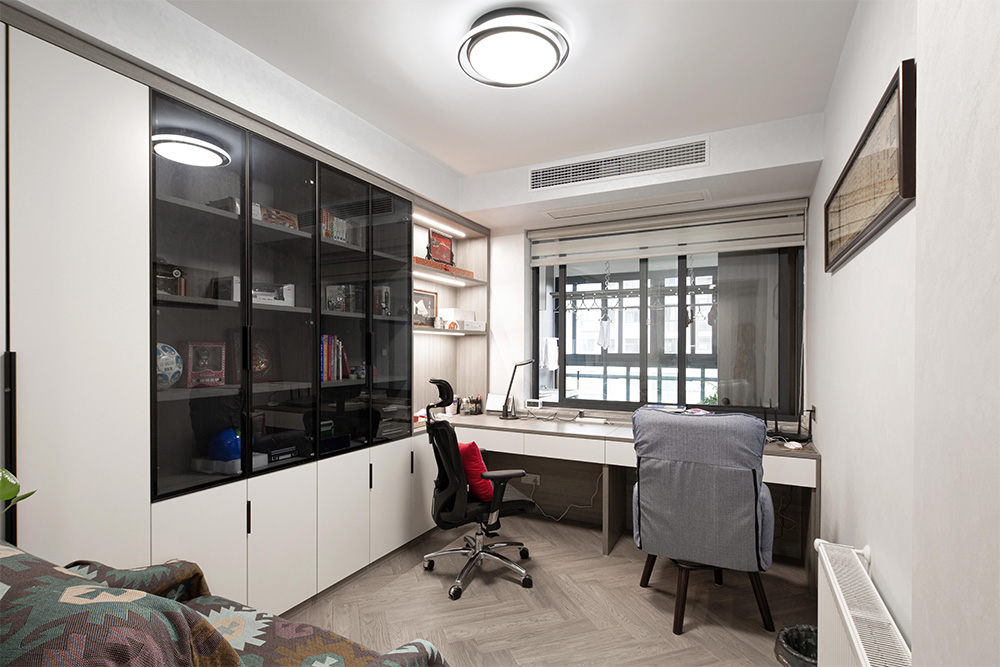 書(shū)房?jī)?nèi)部的空間十分的大氣,白色加黑色玻璃柜門(mén)的設(shè)計(jì),分層儲(chǔ)物方便又快捷。長(zhǎng)條的書(shū)桌可以同時(shí)容納兩個(gè)人辦公,勞累的時(shí)候通過(guò)窗戶便可以眺望遠(yuǎn)方,緩解疲勞。