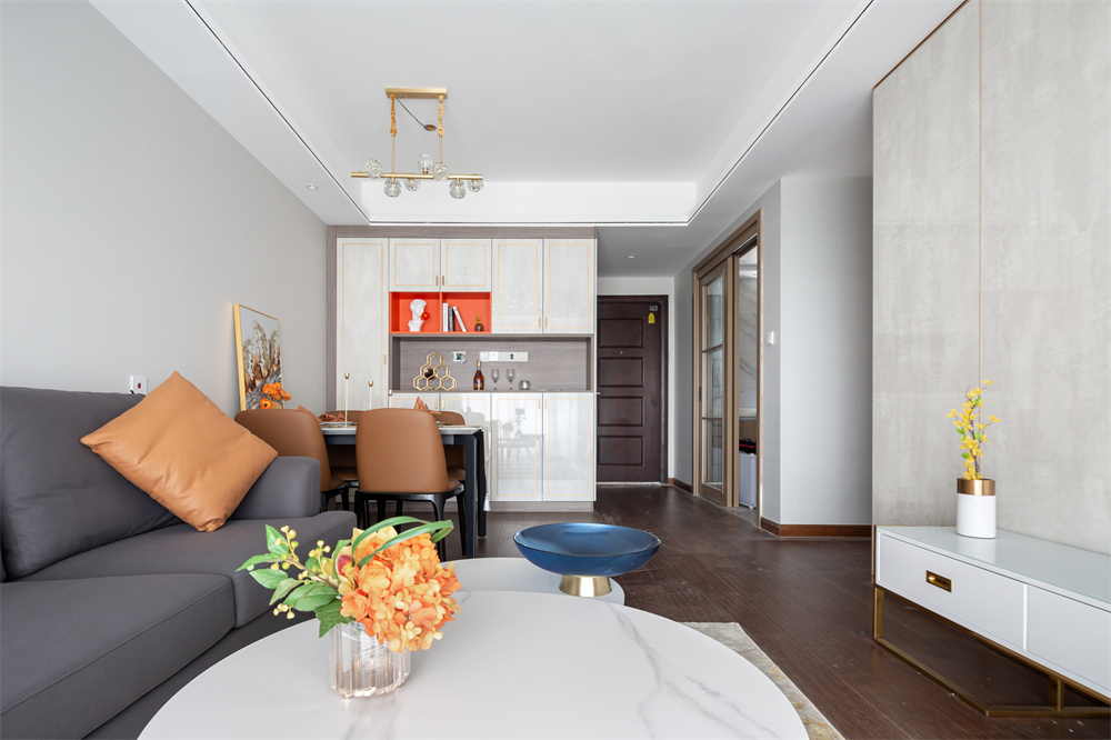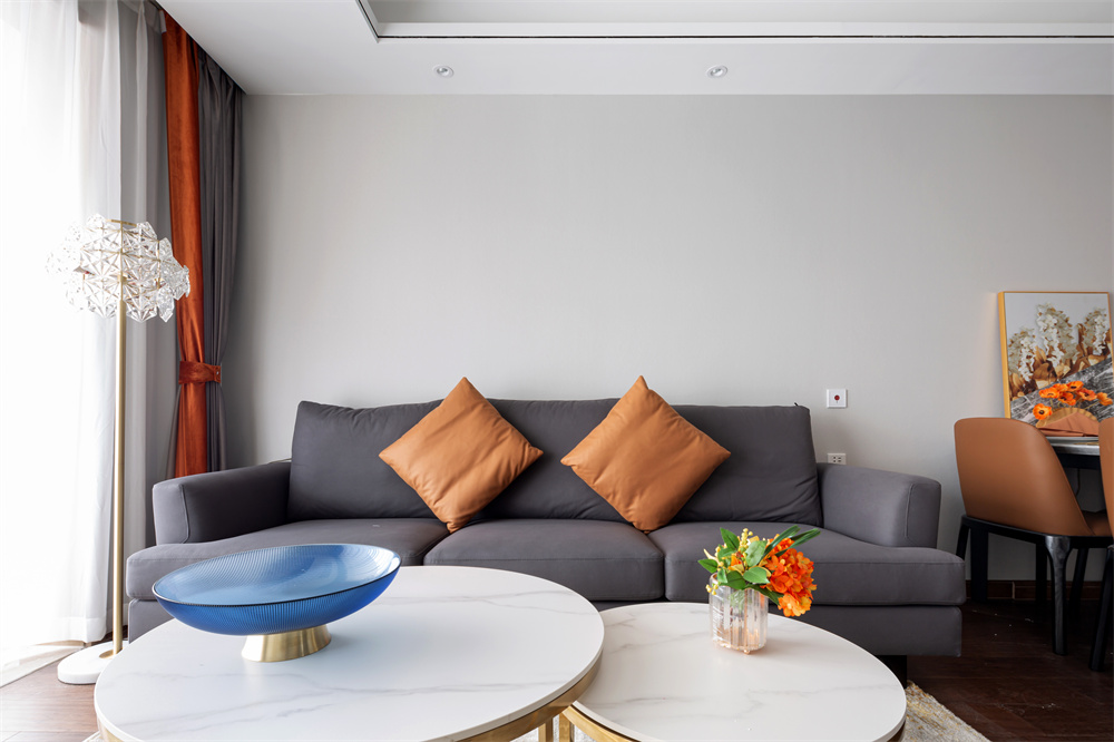 布藝灰色沙發(fā)布料十分柔軟,坐下去沙發(fā)表面也具有一定彈性。橘色的抱枕仿佛將整個空間點(diǎn)亮了一般,與右側(cè)的橘色座椅顏色相呼應(yīng)。圓形拼接的茶幾在寓意上傳遞出“和諧”,搭配金色的桌腳一下子提升了高級感。