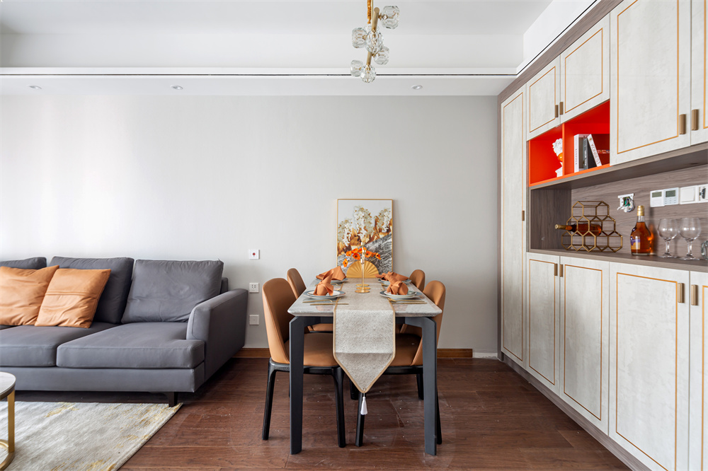 餐廳處的風(fēng)格秉承了輕奢風(fēng)格的特點(diǎn),設(shè)計(jì)師采用橘色、金色、芬藍(lán)構(gòu)成了餐廳的主色調(diào)。正面到頂?shù)牟瓦吂衽c墻面無縫銜接,通過餐邊柜上的擺件便可看出屋主的品味。裝飾物的點(diǎn)綴讓餐邊柜獨(dú)具魅力,金屬酒瓶的架子,對于日常喜歡小酌一口的家庭來說十分合適,如果再安裝酒柜的話空間不夠,餐邊柜的功能相比酒柜更加實(shí)用。