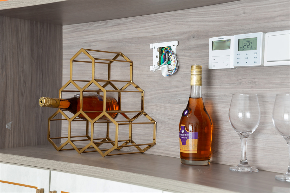 中間為了給開關(guān)留出距離,將中間的兩個分層并為一個分層。芬蘭白色展示出衣柜表面的簡約平整,顏色看上去十分的純潔透亮。