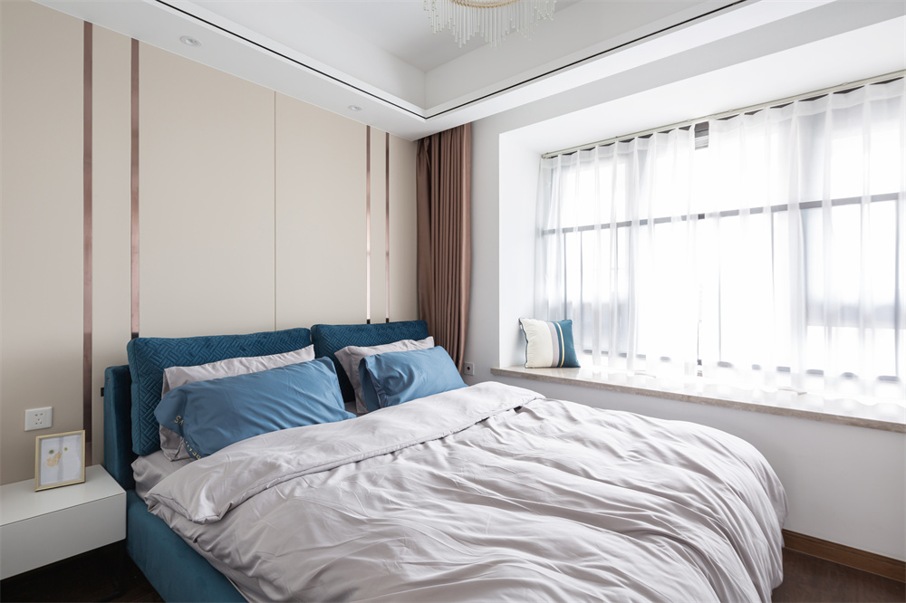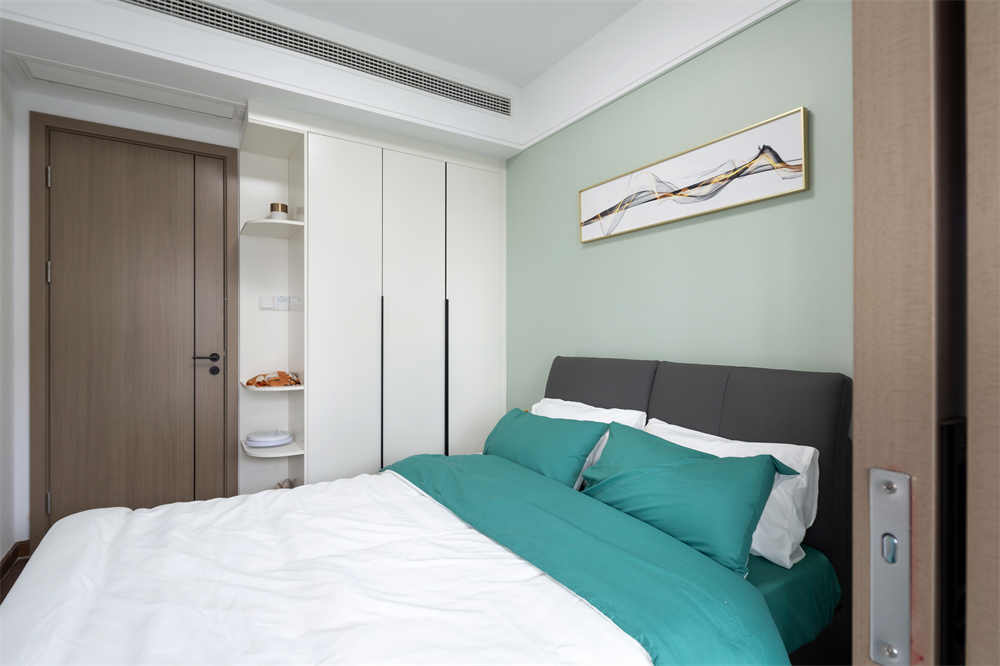 主臥室在沿用輕奢的風(fēng)格同時做了細(xì)微的調(diào)整,薄荷綠色的背景顯得清新又自然,仿佛如修剪草地后散發(fā)的清香。衣柜延伸出的轉(zhuǎn)角區(qū)域充分利用了衣柜旁的空間,可以隨手放置書本、眼鏡、收納籃。