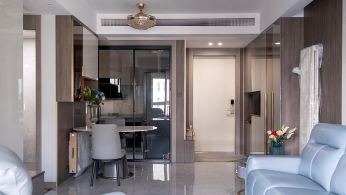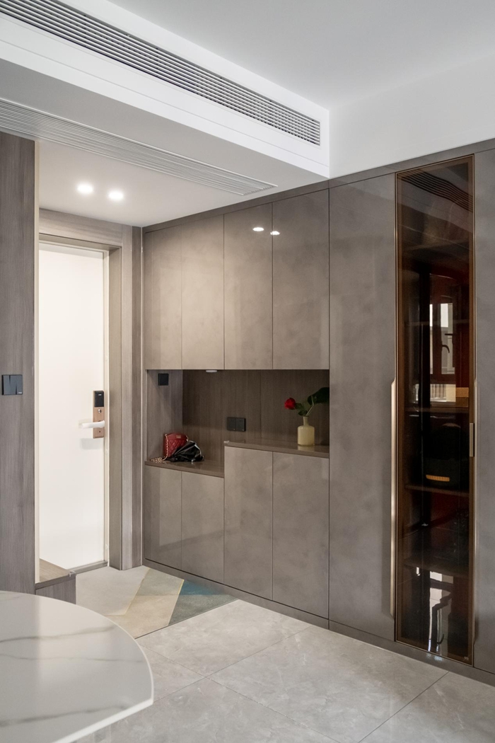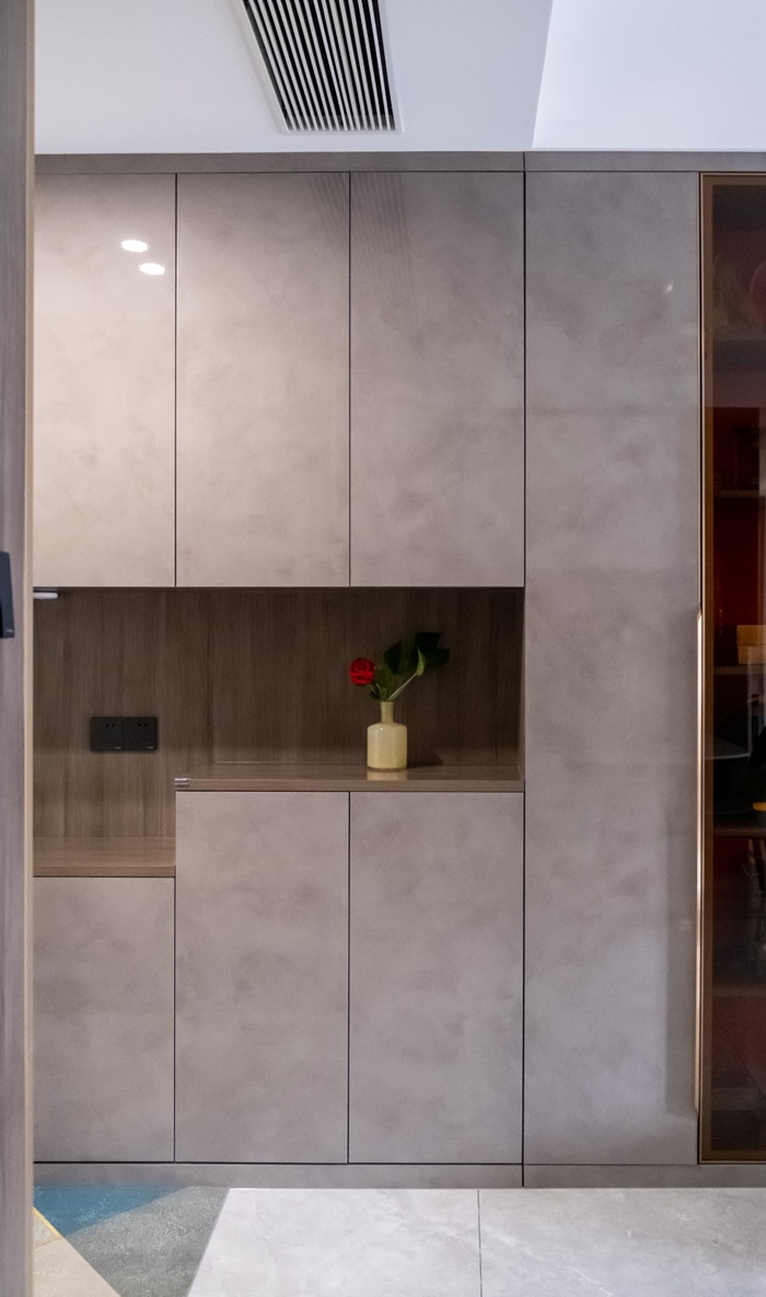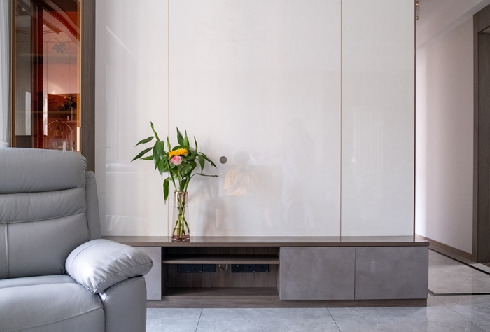 這套實(shí)體案例以簡約和多功能為主,將對家實(shí)用的內(nèi)涵貫穿始終。入戶的玄關(guān)柜便是最具有代表性的。超晶板的板材使用使表面十分透亮有光澤,板材的紋路如云霧般若隱若現(xiàn),來自客來福全屋定制的超晶板式簡約輕奢的代表,表面的光滑、清潔方便是這類板材的亮點(diǎn)。