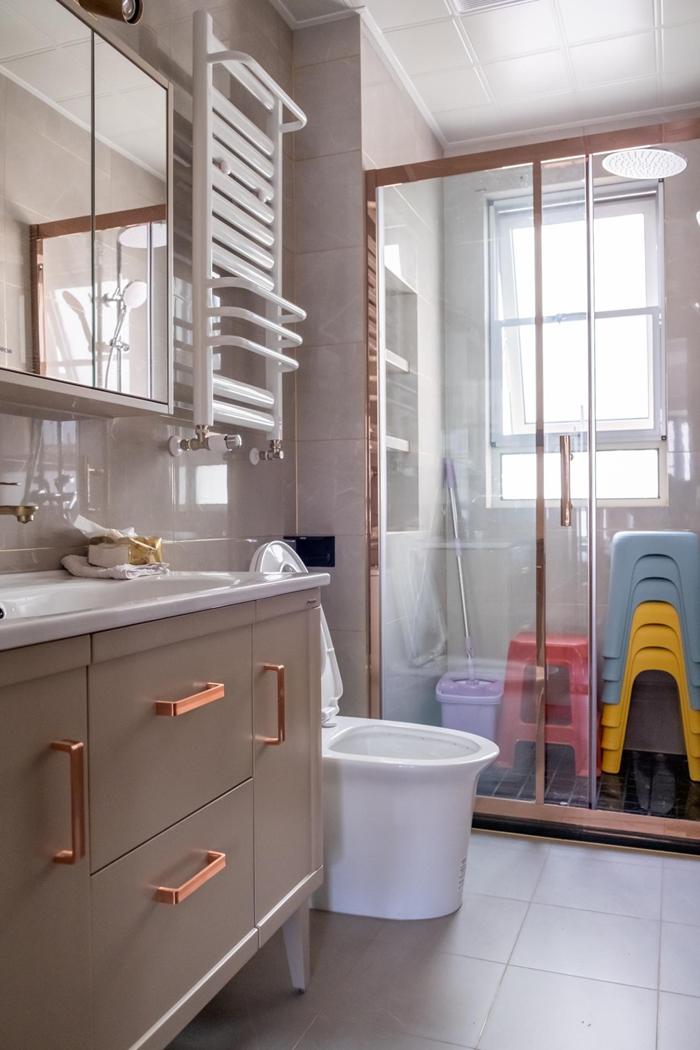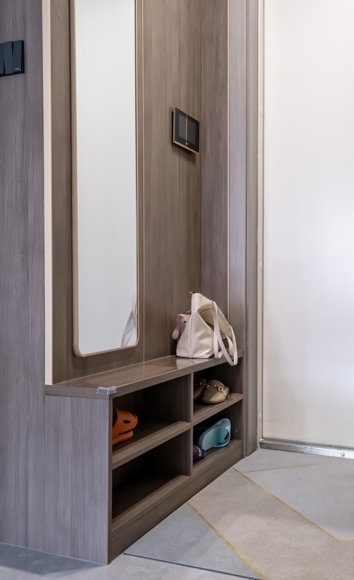 玄關(guān)柜做了從上到底的整面柜體,底部缺乏放置鞋子的空間便在玄關(guān)柜對面打造了四格的換鞋凳,也可以作為鞋柜使用,二合一的用法發(fā)揮了換鞋凳的功能。入戶處安裝了鏡子在離家上班前順手看下今天的裝扮,心情滿分的出門,玄關(guān)柜處的打造處處體現(xiàn)出細(xì)節(jié)和用心。