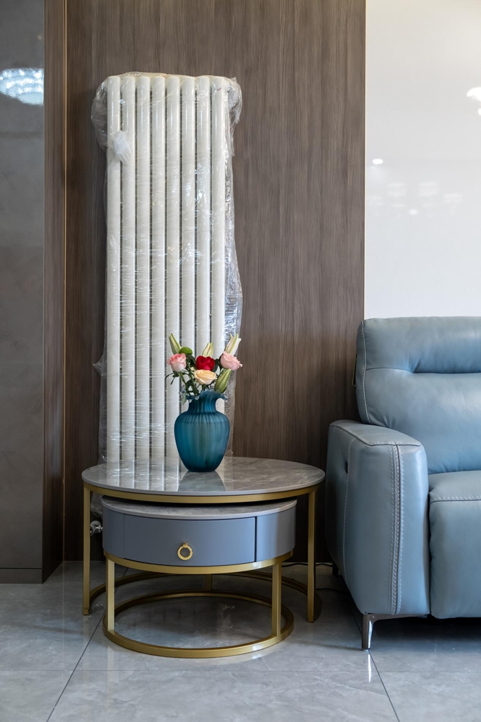 客廳背景墻采用整面超晶板,耐磨易清洗的優(yōu)點(diǎn)受到客戶的喜愛。藍(lán)色的皮質(zhì)沙發(fā)在光線的照射下更加清晰動人,女主人想通過藍(lán)色將整體的色調(diào)更加柔和,給來家里做客的客人眼前一亮的感覺。