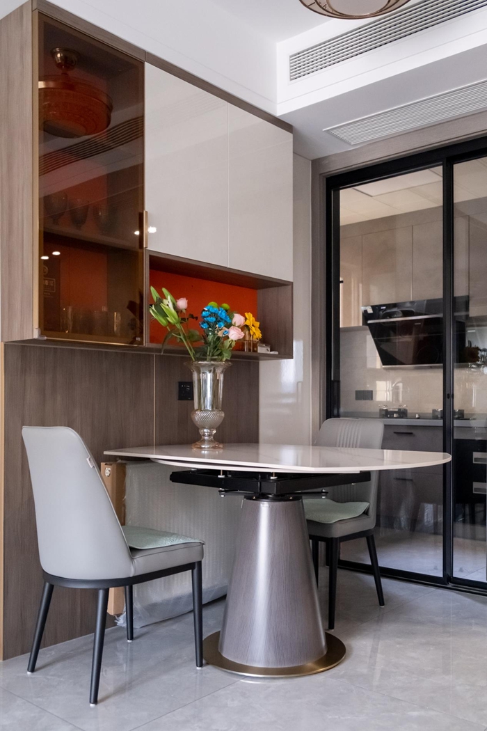 在入戶的拐彎處便是餐廳所在的位置,長方形+橢圓形的餐桌設(shè)計(jì),拐角處圓潤可保護(hù)日常免受傷害。餐桌的上方打造四格的餐邊吊柜,符合人體高度的設(shè)計(jì),抬手便可以拿到想要的物品,蠟燭、餐盤、餐勺一些小物品可以放在餐邊柜上,方便使用。