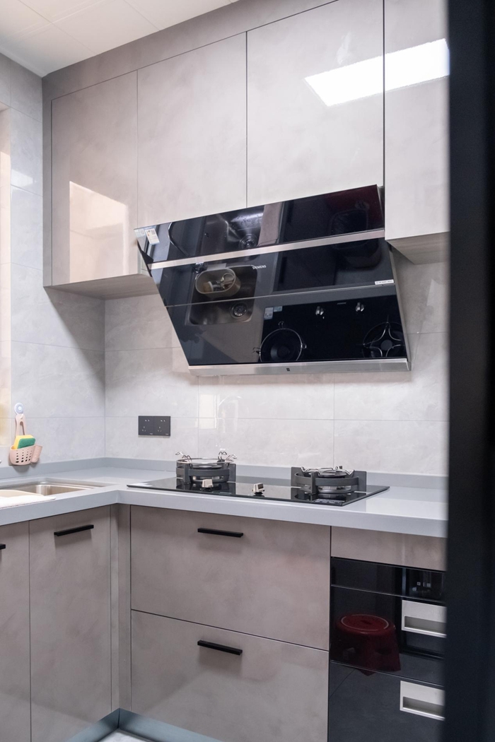 廚房處的打造簡簡單單滿足三口之家做飯的需求,在灶臺旁留出點(diǎn)空間便于日常飯菜的放置。上方是抽煙機(jī),下方是放置洗碗的收納.灶臺的寬度略多于柜體中把手的寬度,在做飯時(shí)不會因?yàn)榘咽执恋?,來來回回更加舒適。