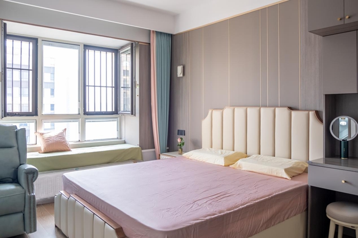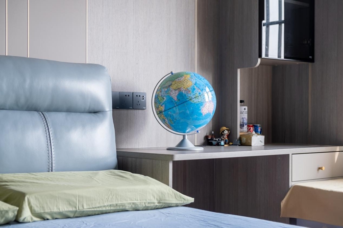 次臥處帶了一個(gè)飄窗可以打造成休閑區(qū),鋪上柔軟的床墊,在飄窗處看書、喝茶、看電視劇感受到人生的愜意。次臥處最大的亮點(diǎn)便是利用剩余空間進(jìn)行組合柜體的打造,吊柜的設(shè)計(jì)不會占用額外的空間,但是要注意吊柜的高度,要便于日常的物品拿取擺放。