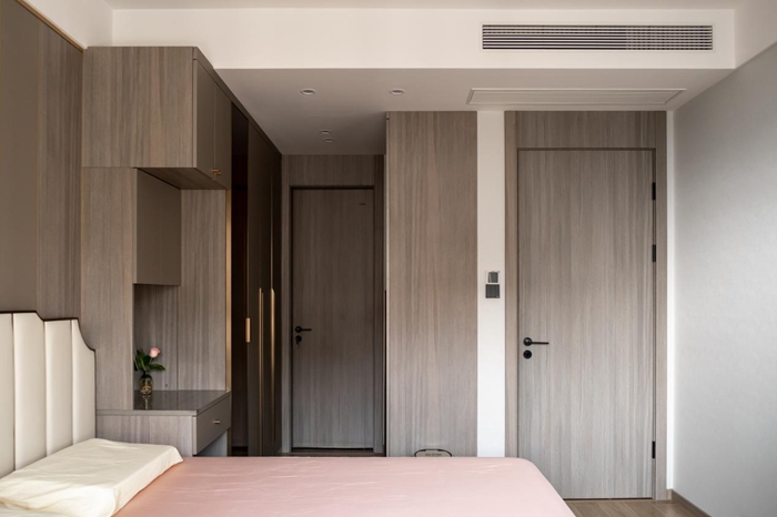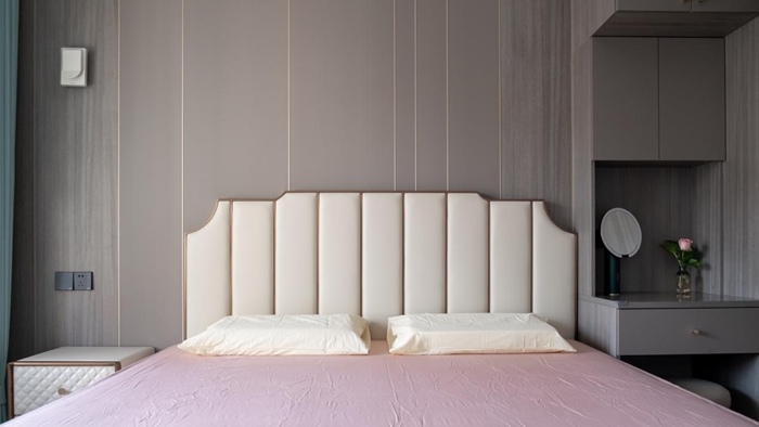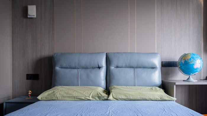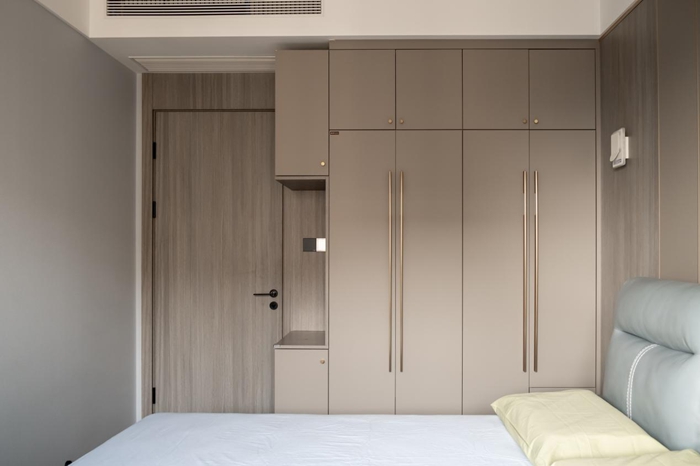 次臥相比于主臥少了一個(gè)衛(wèi)生間的空間,整面到頂?shù)囊鹿裨谧髠?cè)加了轉(zhuǎn)角衣柜的設(shè)計(jì),為插座留出些許的空間。