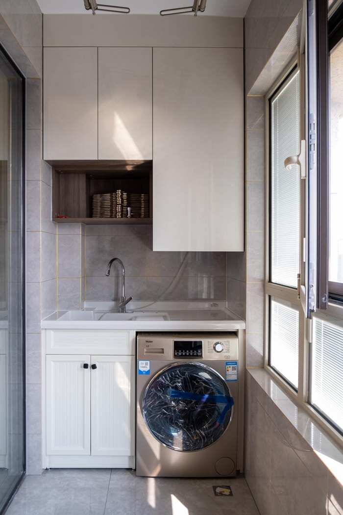 白色膜壓門板采用精湛的工藝制成,窗外的百葉窗將光影變化,透過百葉窗間的縫隙折射在地面上。陽臺處吊柜沒有安裝把手,采用按壓的方式彈開。