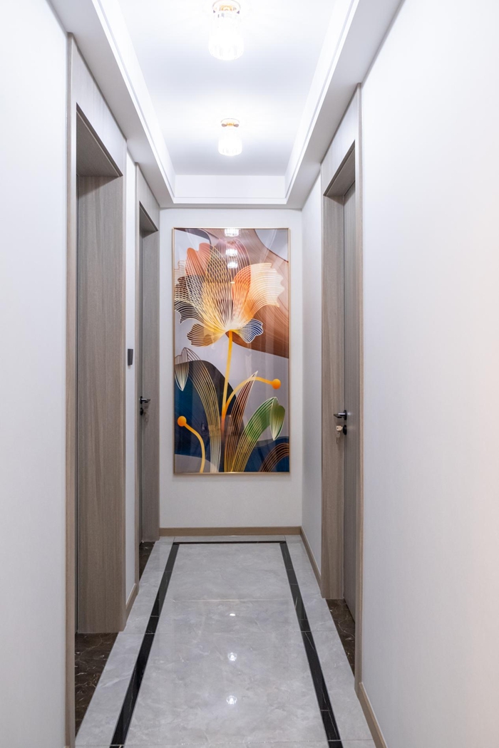 若是走廊寬敞做整面的柜體可以增加室內(nèi)收納空間,走廊盡頭的畫作色彩上的大膽碰撞,給人以視覺方面的沖擊。