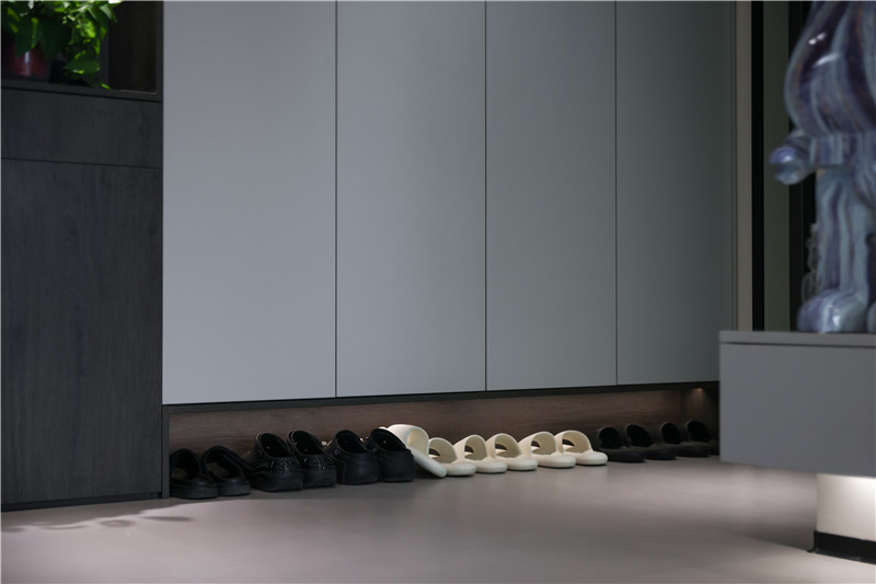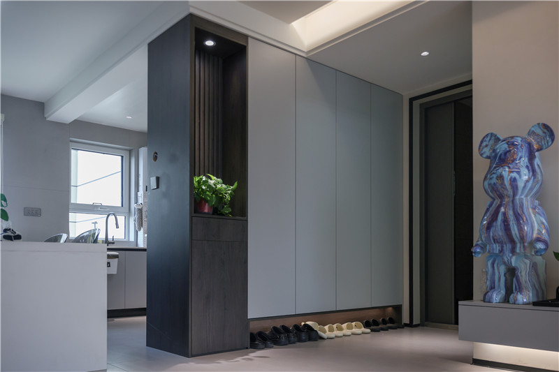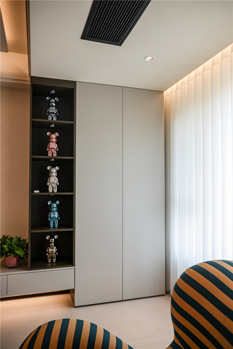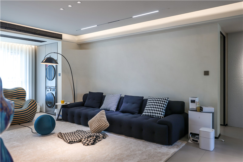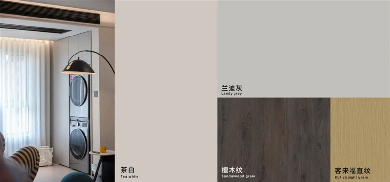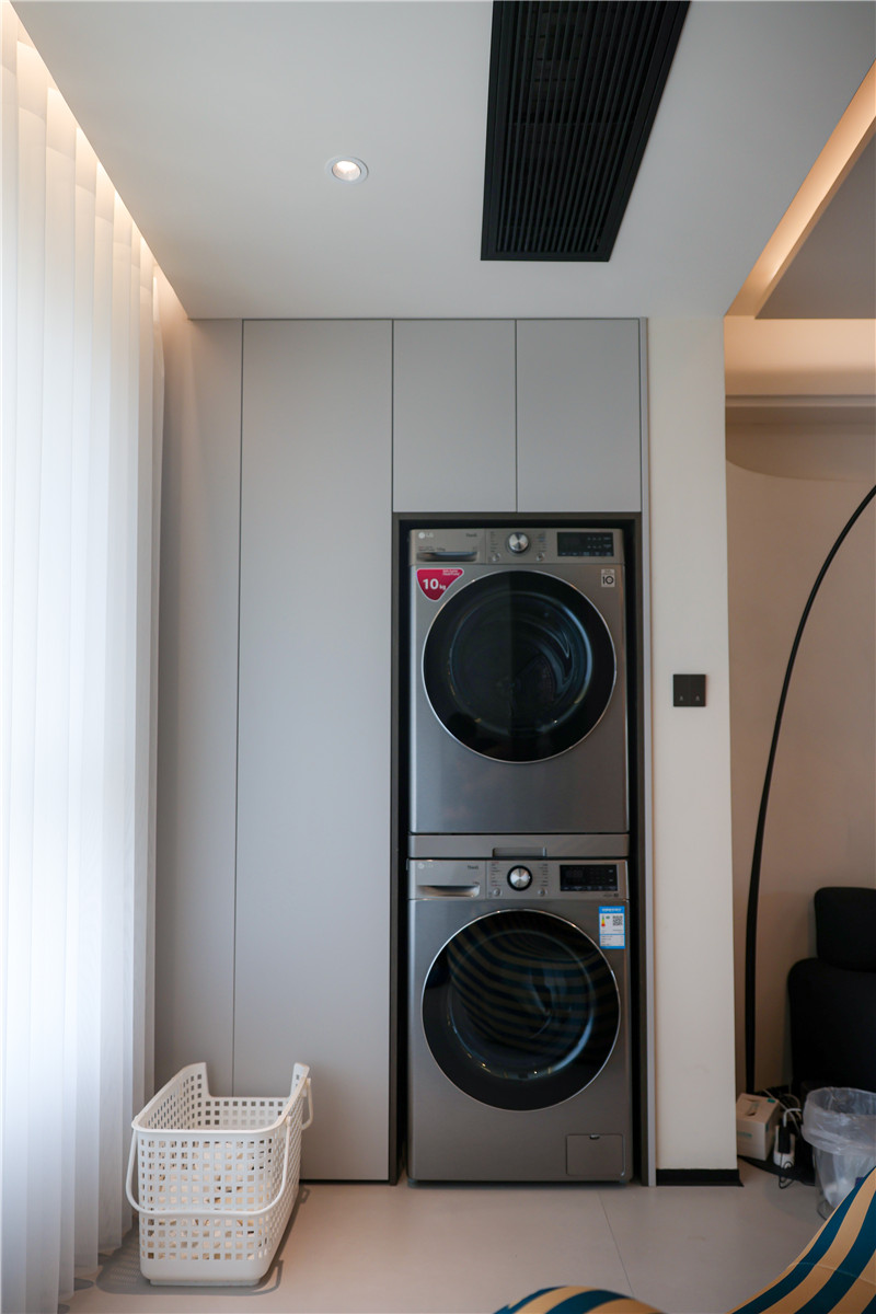 陽臺一側(cè)選用展示格+到頂收納柜進(jìn)行儲物與展覽,另一側(cè)根據(jù)家電做洗衣柜,空間理想化利用,讓家有更多自由空間但依然有序。