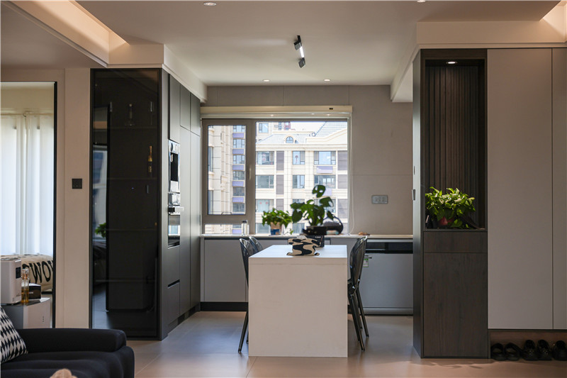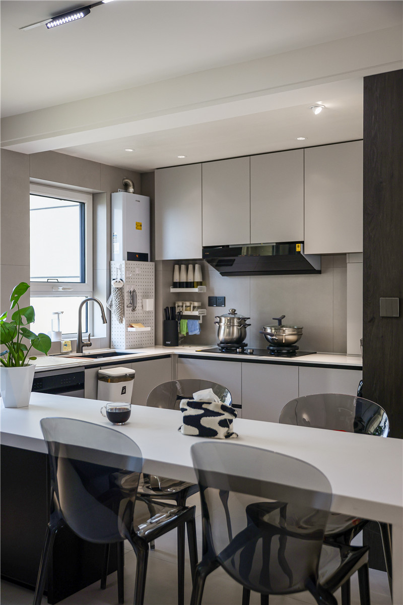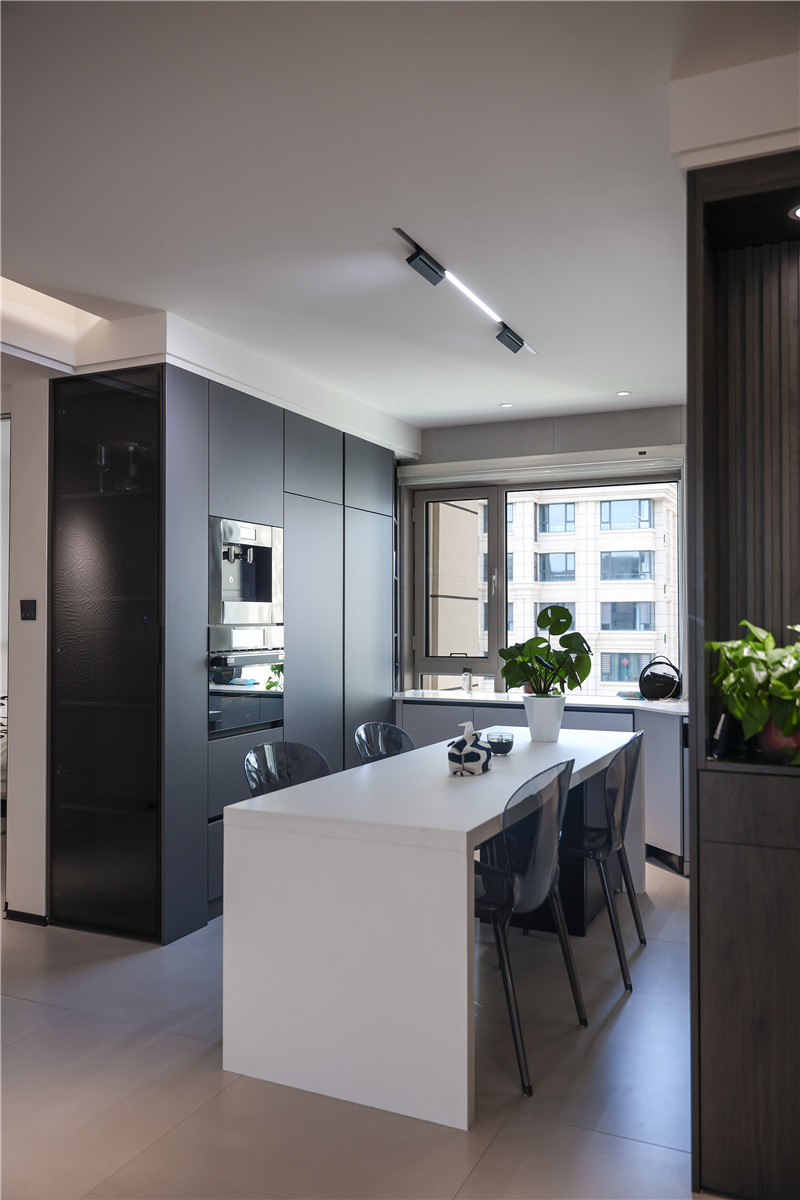 餐廳以白色系餐桌搭配透明餐椅,增添空間時尚感;靠墻一側(cè)做餐邊柜,檀木紋搭配水洗灰,撲面而來的意式極簡風(fēng),內(nèi)嵌家電+免拉手設(shè)計,給人不費勁的精致感。