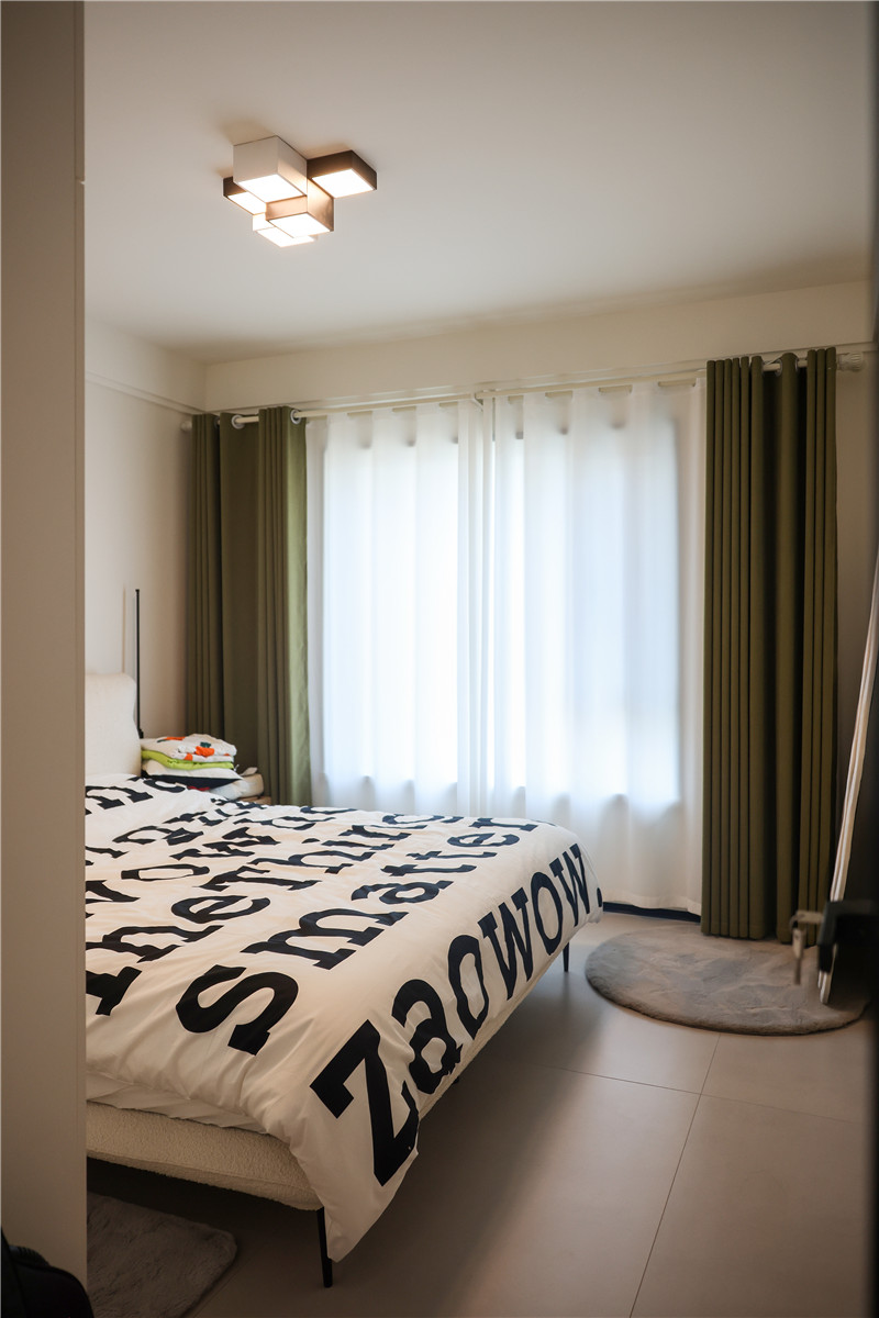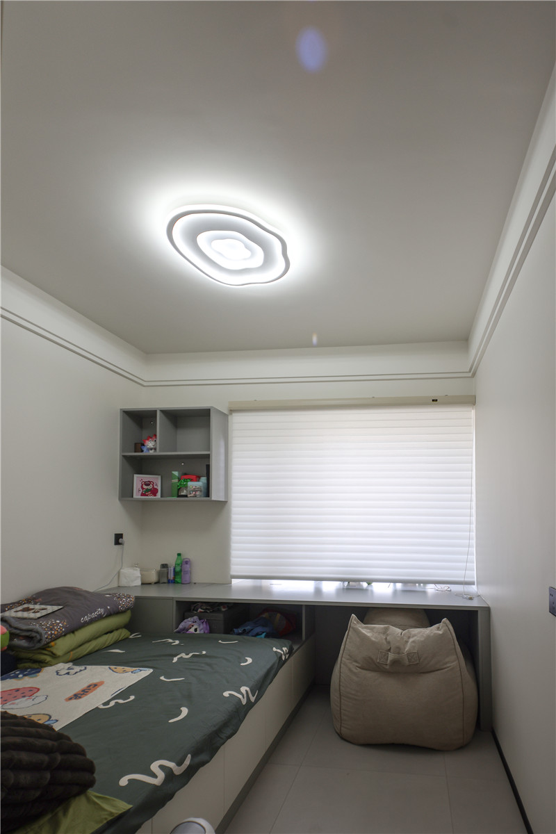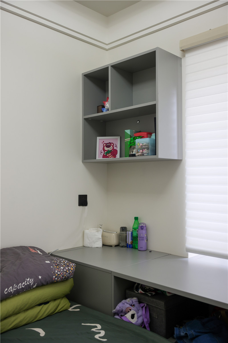 次臥空間與兒童房都在睡眠區(qū)+收納區(qū)的基礎(chǔ)上各自增設(shè)人性化定制的家居產(chǎn)品,例如兒童房中在床尾設(shè)計的長書桌以及壁掛式收納格,讓整個房間功能更為豐富。