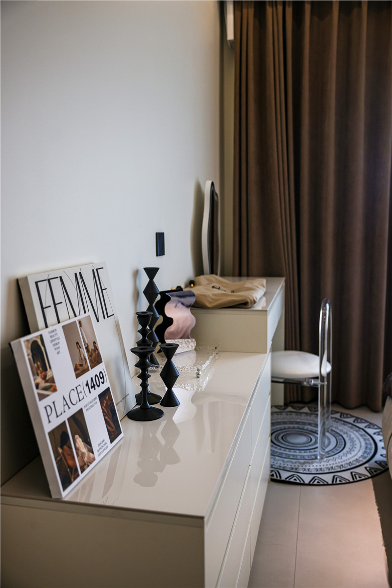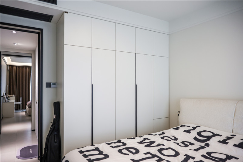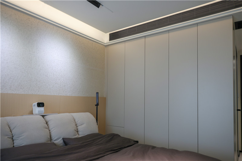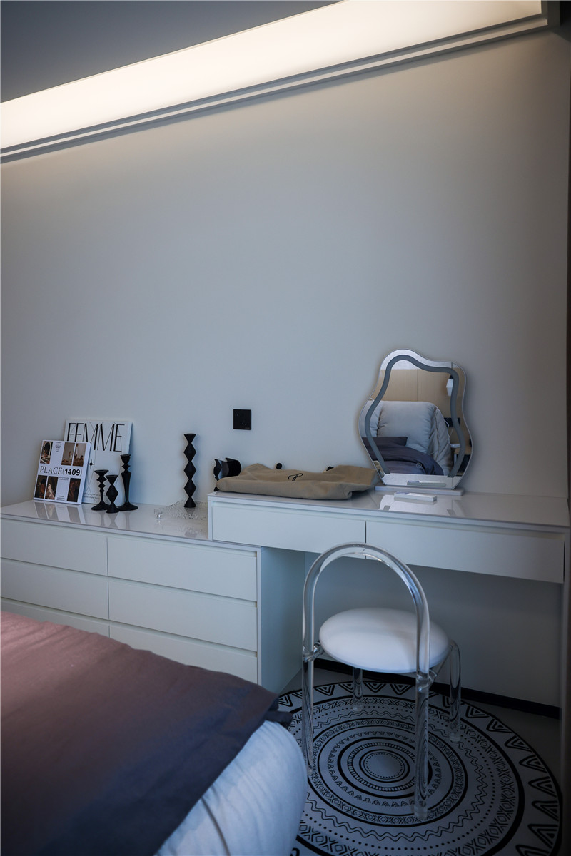 因為家里沒有做衣帽間,所以在主臥中,客來福打造了一面到頂高柜進(jìn)行衣物儲納,茶白的色調(diào)清冷高級,同樣也運用在床尾的斗柜上,抽屜造型更便于拿取物品。與斗柜相連,同色系同材質(zhì)的梳妝臺也滿足了居者的生活需求。