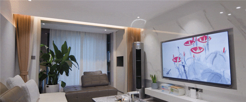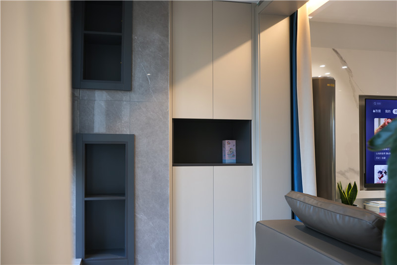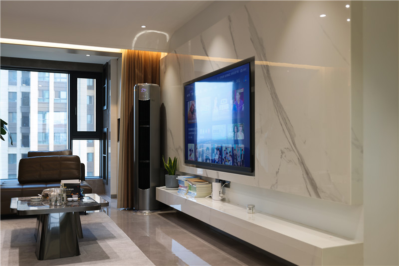 電視背景墻為大理石紋,將電視機(jī)整體嵌入,視覺延展;底柜整面抬高做懸浮設(shè)計,是收納柜,頂部擺上裝飾物不在話下,這立體感也是讓人愛了。