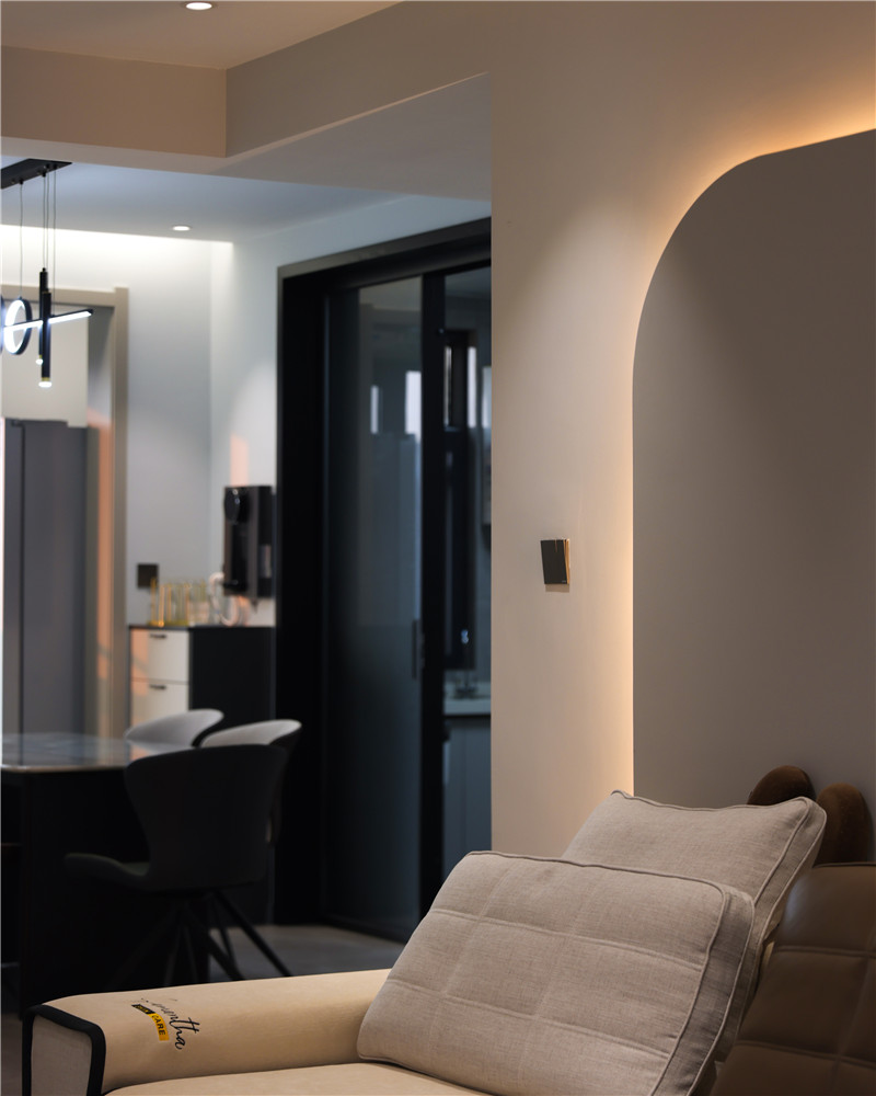 秉承現(xiàn)代簡約的高定思維,以水灰及茶白為基調(diào),用圓弧線條綜合布局,輔之以燈光調(diào)和,讓整體空間自然溫柔,卻暗藏一絲恢弘之意。