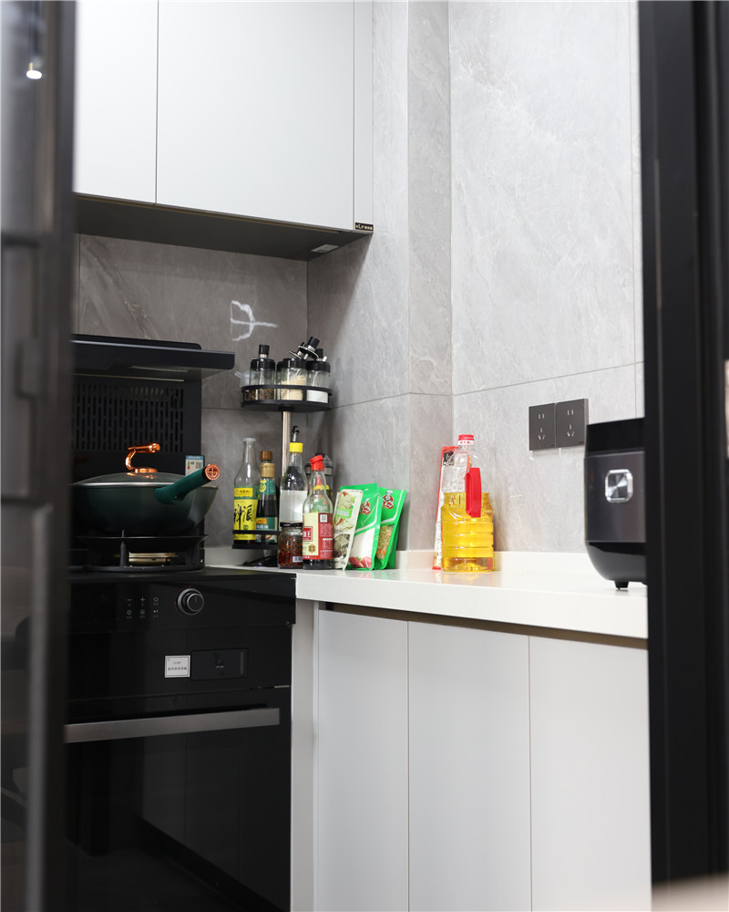 櫥柜貼墻而建,柜與電器組合收納力、實(shí)用性在線;遵循洗→切→烹→盛的動線,提高生活便捷度;臺面巖板,耐刮、防水性能好。