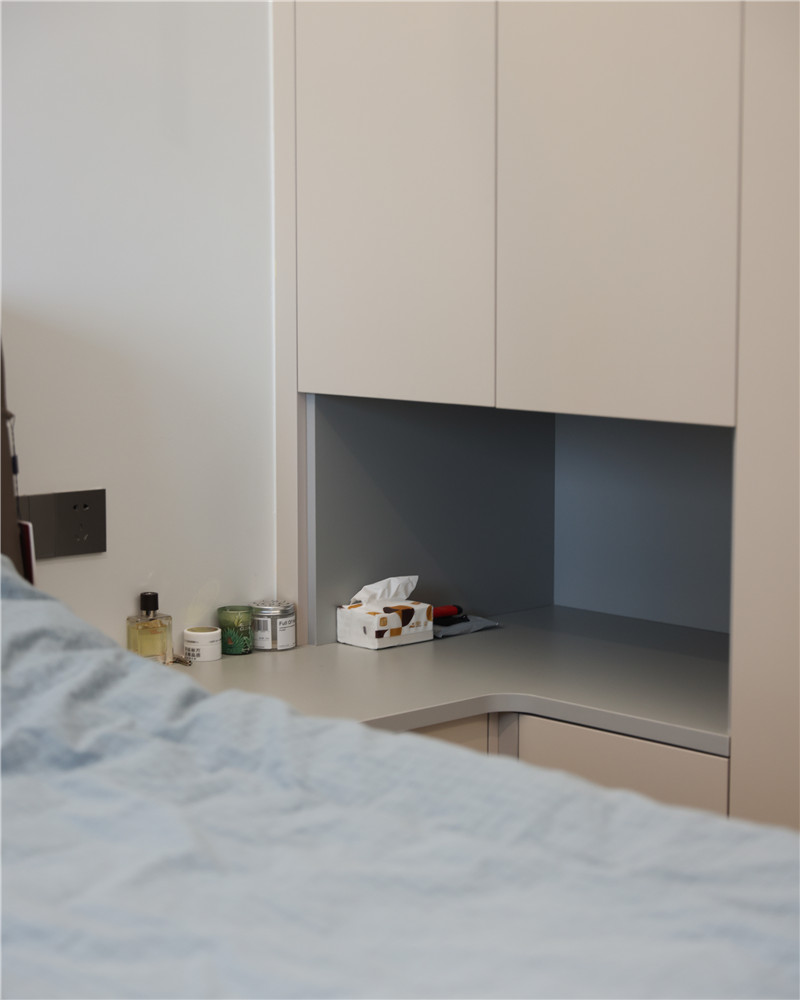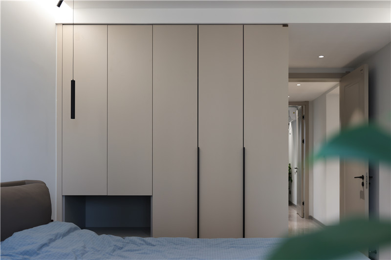 主臥采用無主燈設(shè)計,內(nèi)嵌燈光與射燈營造空間氛圍感;靠窗邊做了一個嵌入柜,不占地方還分散了室內(nèi)的存儲壓力。