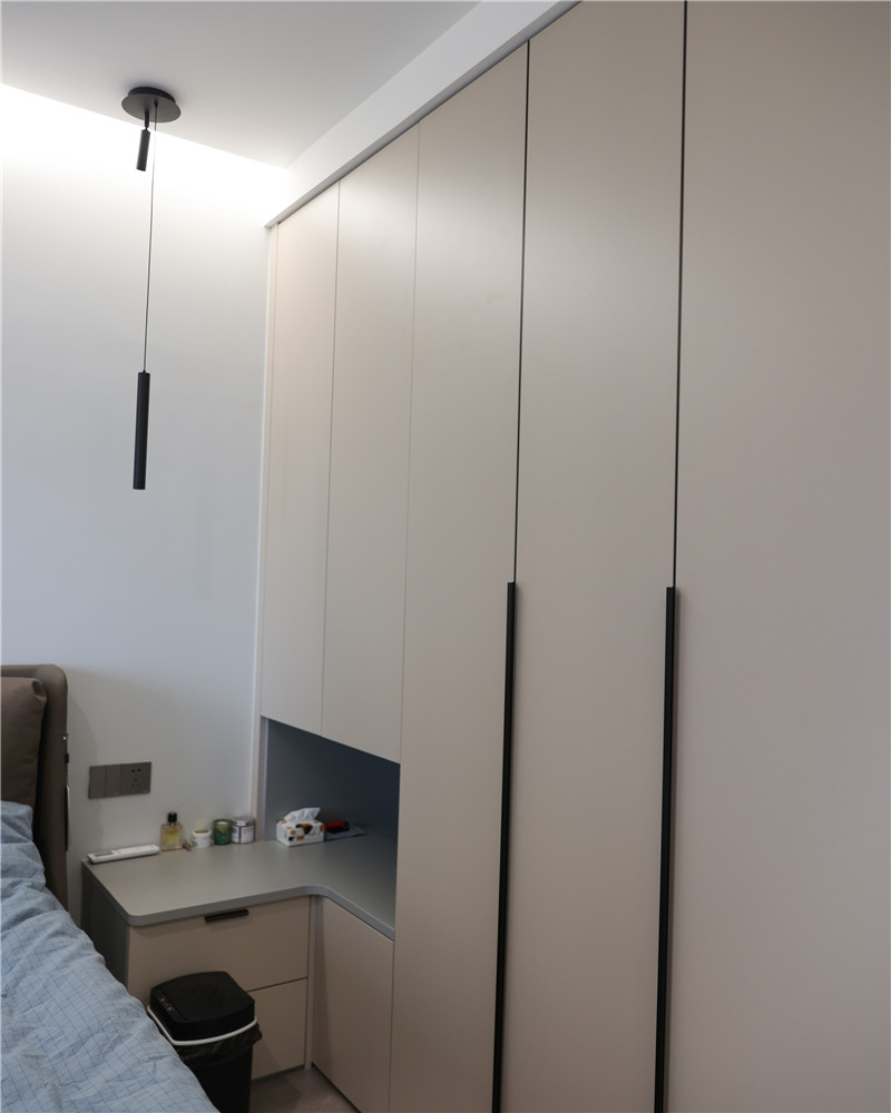 次臥做了一組到頂衣柜,茶白色門板好看好搭;為了節(jié)省空間,設(shè)計師從柜體中延伸做床頭柜,頗具特色;整體布局簡約大氣,協(xié)調(diào)整體氛圍。