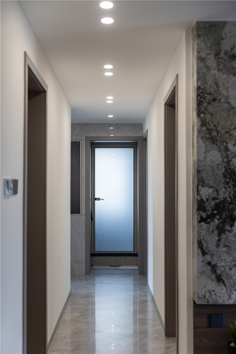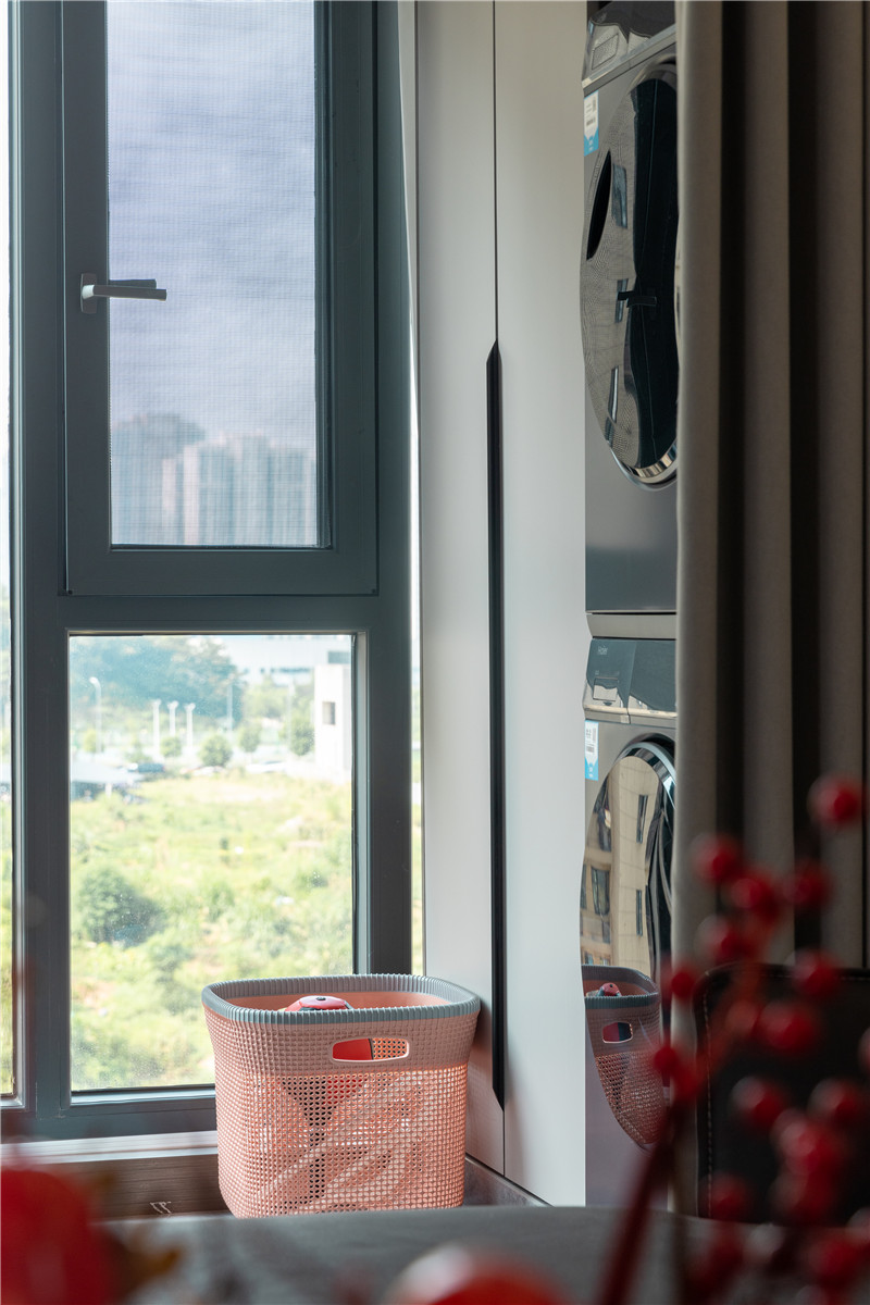 在這戶案例中,收納需求和居住的舒適性是屋主所追求的。所以在陽臺(tái)空間上,屋主與設(shè)計(jì)師也通過兩組柜子讓家變得更干凈。一側(cè)做家政柜嵌入洗烘家電,到頂高柜內(nèi)部分區(qū)合理,很實(shí)用。
