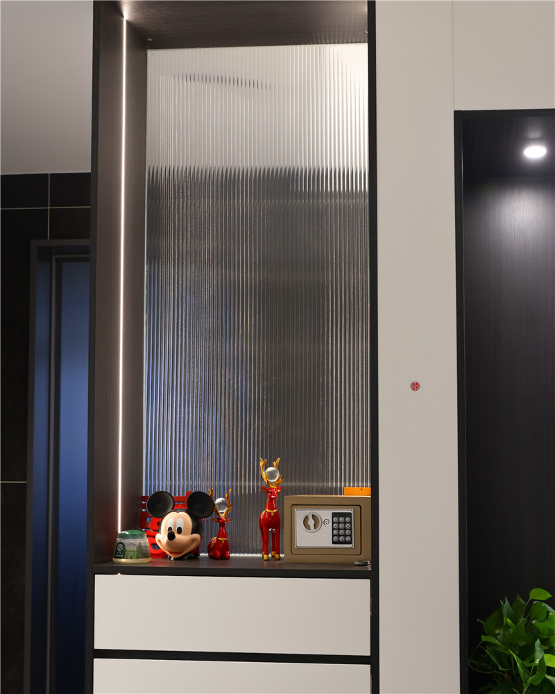 此玄關(guān)柜也充當隔斷的作用,整面白玻配合型材拐彎,若隱若現(xiàn)感讓人眼前一亮。