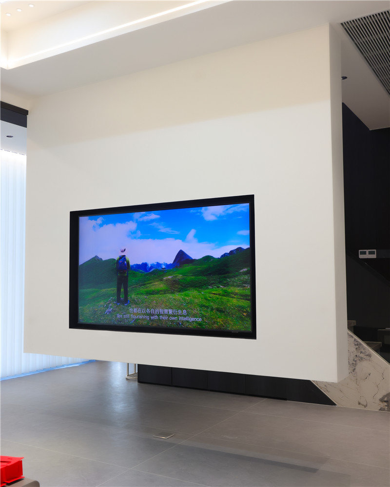 電視背景墻整體挑高處理,內(nèi)嵌電視機,“躺平”式觀劇一整個爽住,還方便衛(wèi)生清理;沙發(fā)背景墻做圓弧造型頗富藝術(shù)感,配以燈光的運用,氛圍感躍于空間。