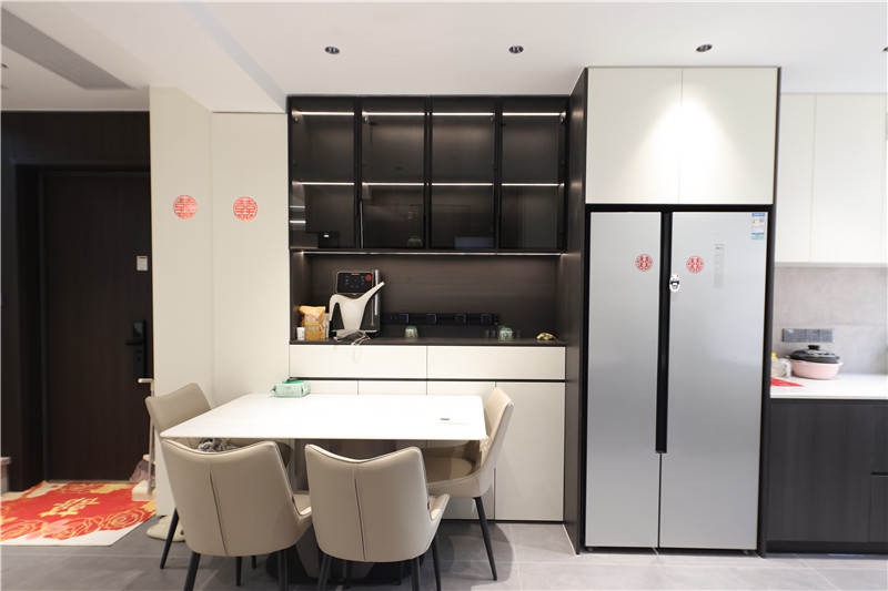 到頂餐邊柜,采用芬蘭白門板與黑木紋柜體,跳色設(shè)計更具視覺沖擊力;中部掏空預(yù)留,可放小物件及咖啡機等小電器。