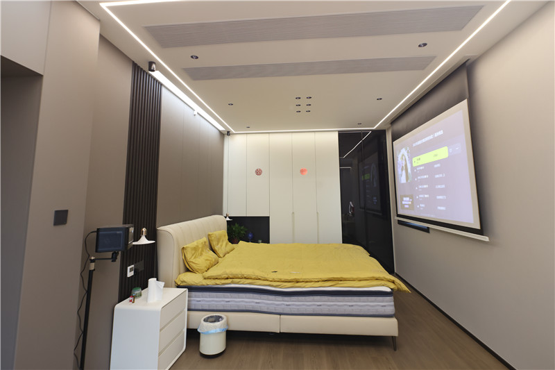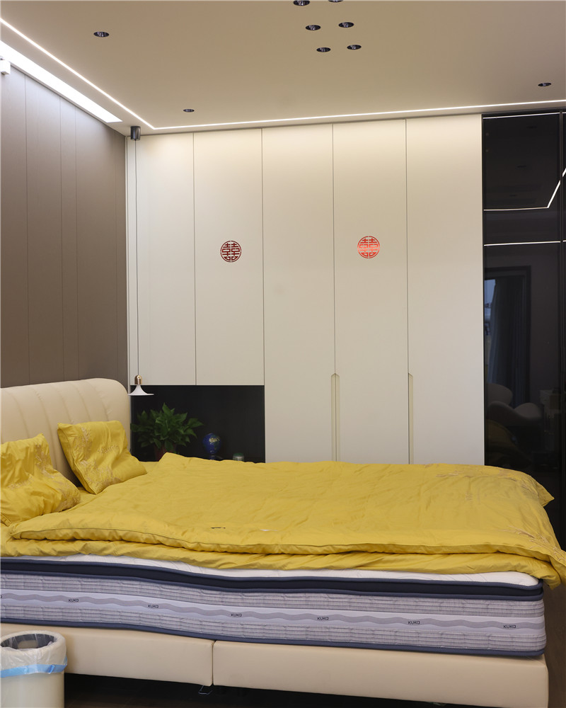 臥室一側(cè)整面立柜,配合銑槽拉手簡約利落;梳妝臺抬高設(shè)計,融入圓弧造型,典雅溫柔;整體空間主燈與輔燈相結(jié)合式設(shè)計,空間層次感強。