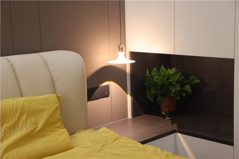床頭背景墻加入格柵設(shè)計,增強設(shè)計感;床頭柜弧形收邊,配合以小吊燈,氛圍感滿滿。