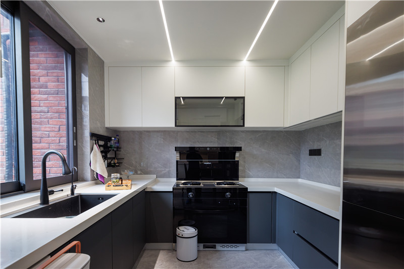 餐廚空間的設(shè)計(jì)風(fēng)格與起居空間保持一致,除了傳統(tǒng)的U型封閉式中廚外,在用餐區(qū)還做了高定全屋圍合的設(shè)計(jì)。