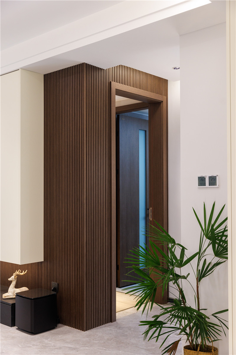 在玄關(guān)為了提升空間利用率,我們采用了嵌入式的柜體進(jìn)行上下分區(qū)收納。中部掏空后延伸大理石臺(tái)面作為置物臺(tái),放置一些小物品都很實(shí)用。