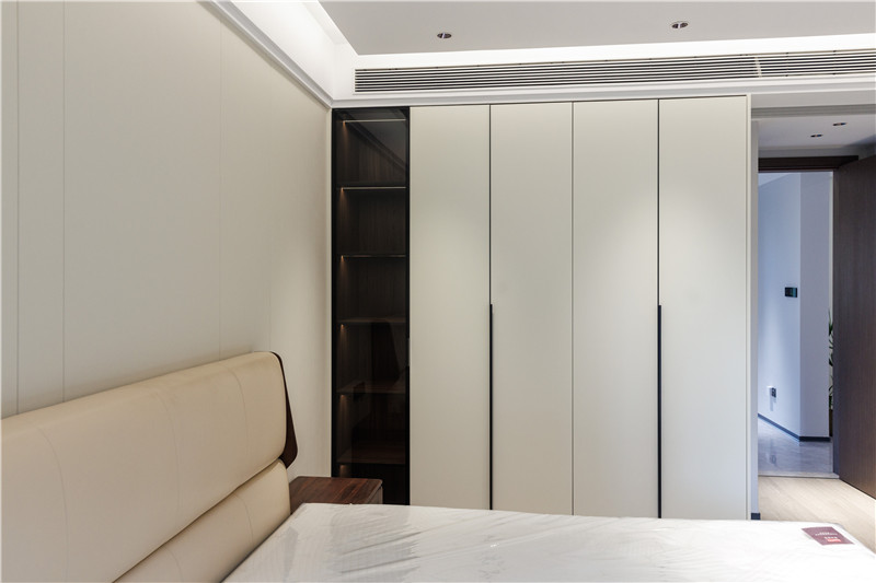 主臥空間延續(xù)一貫簡約的設(shè)計(jì)手法,注重提升家居質(zhì)感,強(qiáng)調(diào)人文的居住感受。自客廳格柵背景墻延伸至臥室空間,做成一體化的門套門框及門扇。