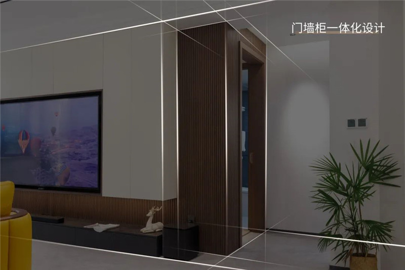 細(xì)格柵的造型墻板為墻面增加了立體感,一字型深灰色地柜直接落地,內(nèi)嵌3D霧化暖爐,帶給家更多溫馨