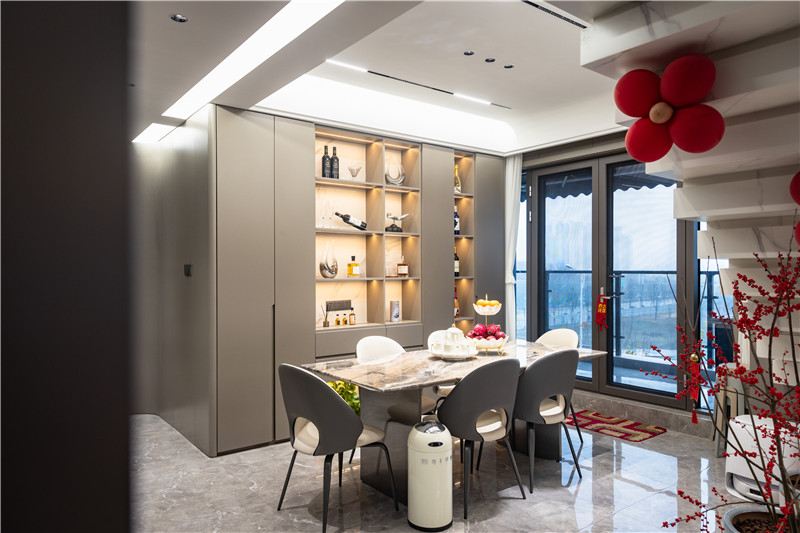 櫥柜柜體以簡約黑拉手配以無拉手設計,視覺上清爽利落;將烤箱、冰箱大電器嵌入高柜中,和諧布局;餐廚空間以推拉門做區(qū)隔,有效解決頑固污漬困擾,讓空間更加明亮干凈。