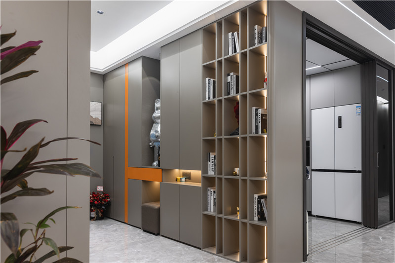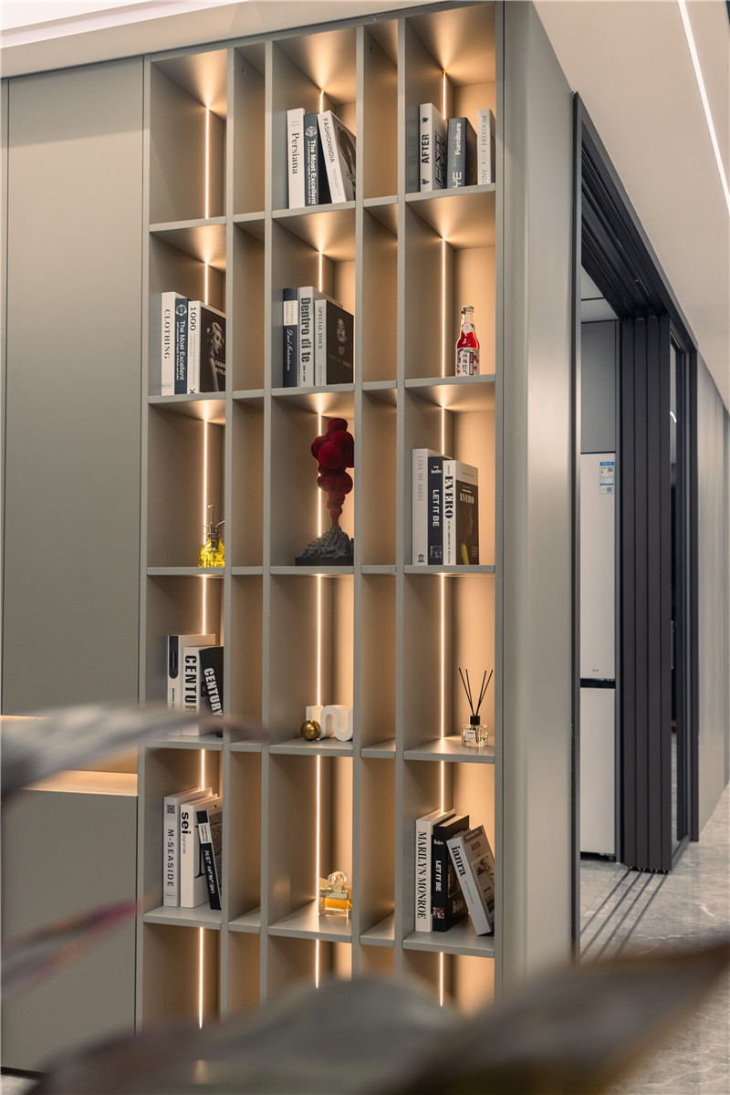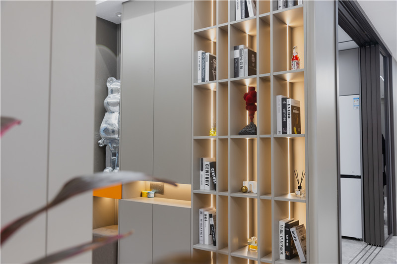 玄關柜一側做隔層,嵌入條帶燈,是裝飾區(qū)、也是閱覽區(qū)。