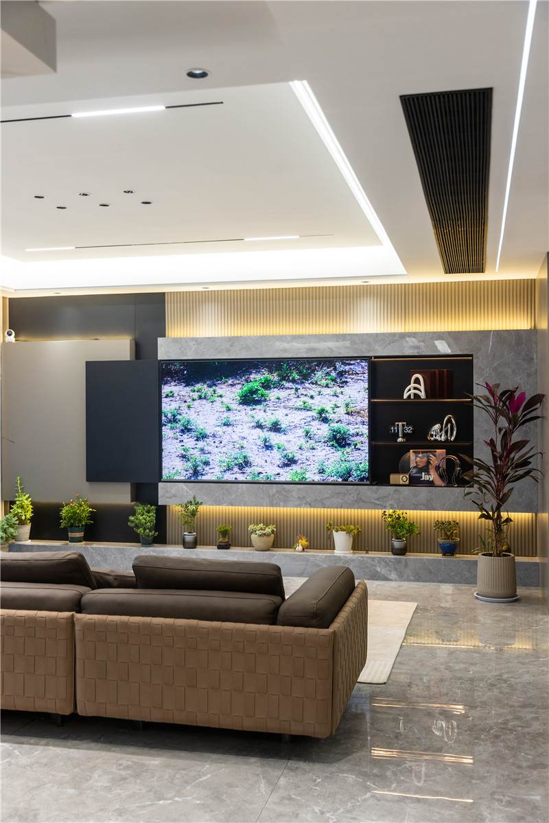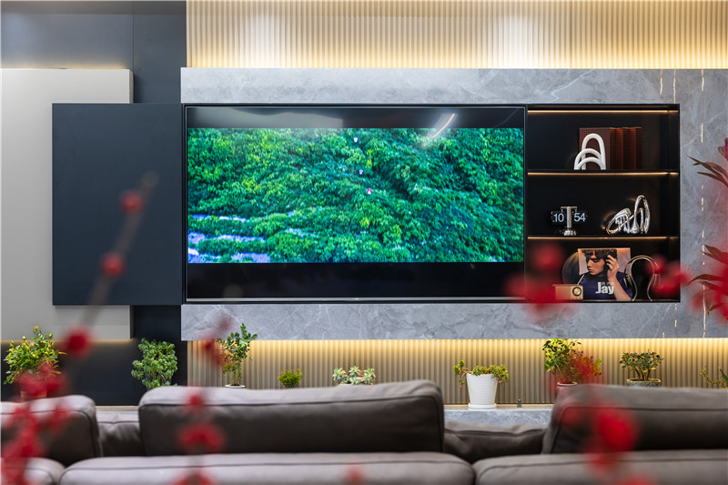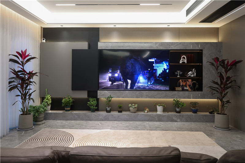 客廳高級構造,以創(chuàng)意、新意展現(xiàn)定制魅力。整體開放式設計,以無主燈設計突顯空間氛圍感,氣質顯露。