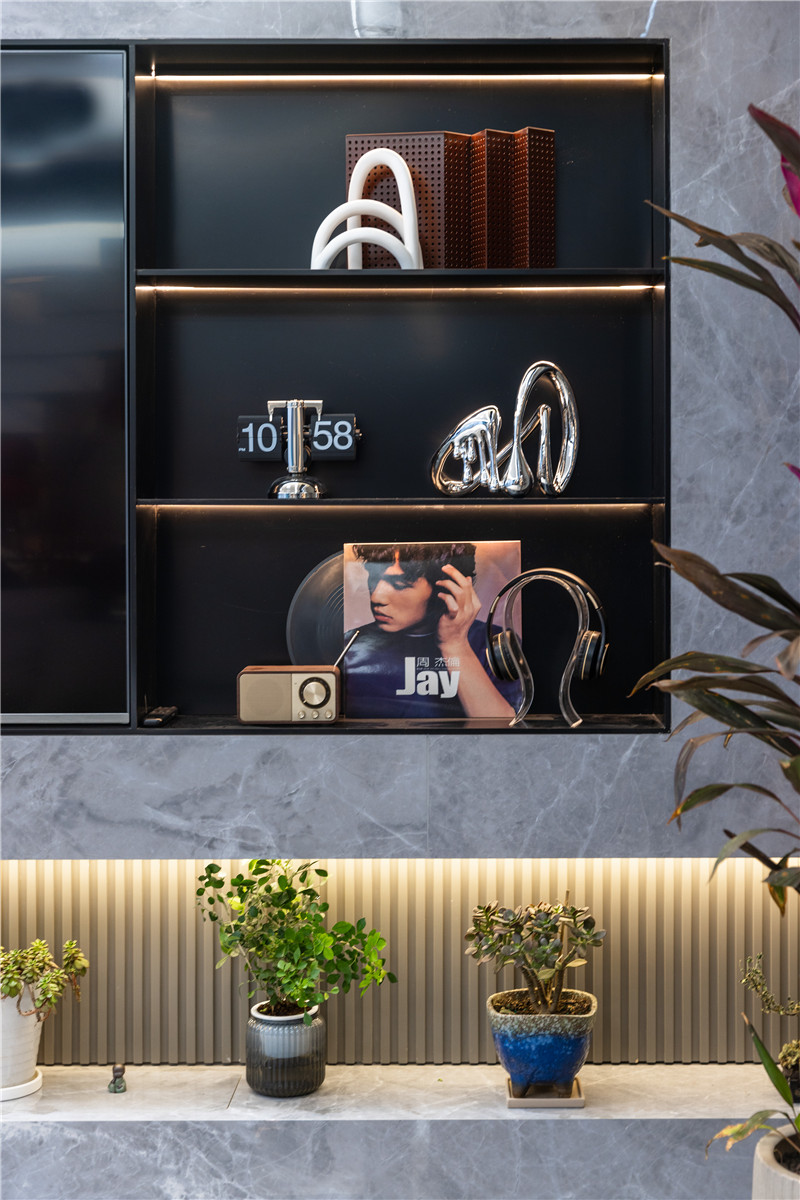 背景墻采用縱向格柵及跳色,視覺感強;大理石板、門板拼接,其挑高設計突顯層次感;電視機旁側協(xié)調裝飾柜,深色調縱深感強。