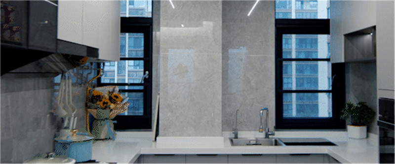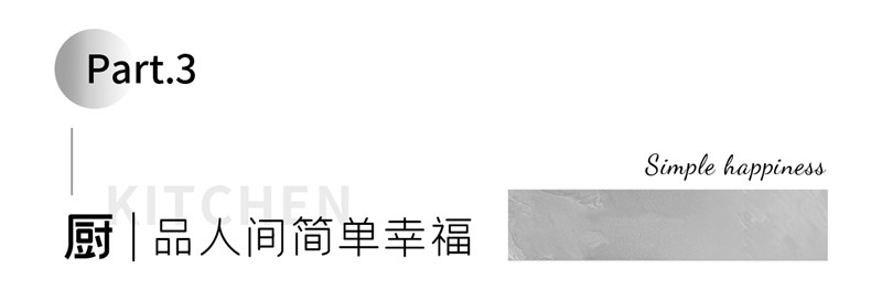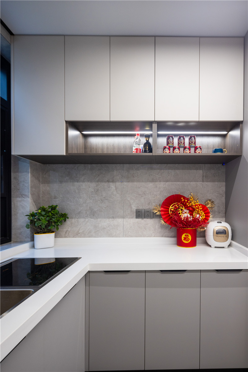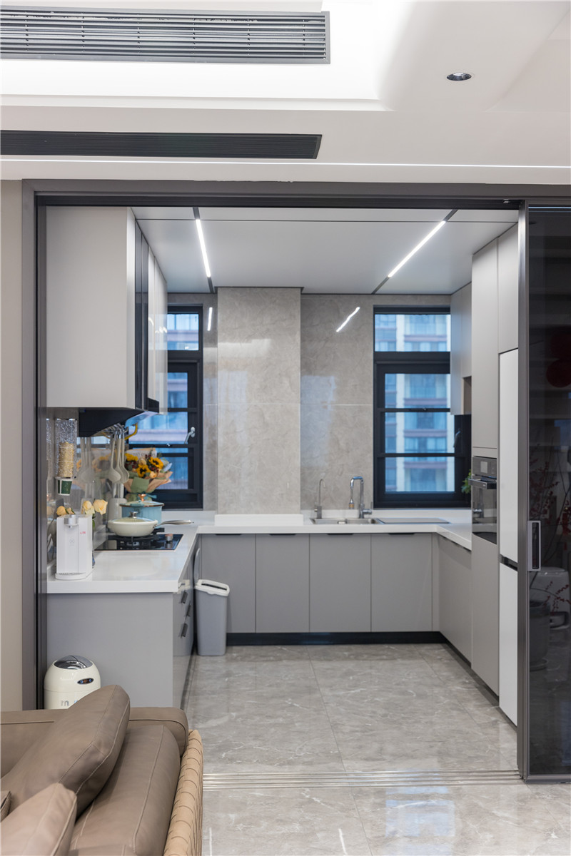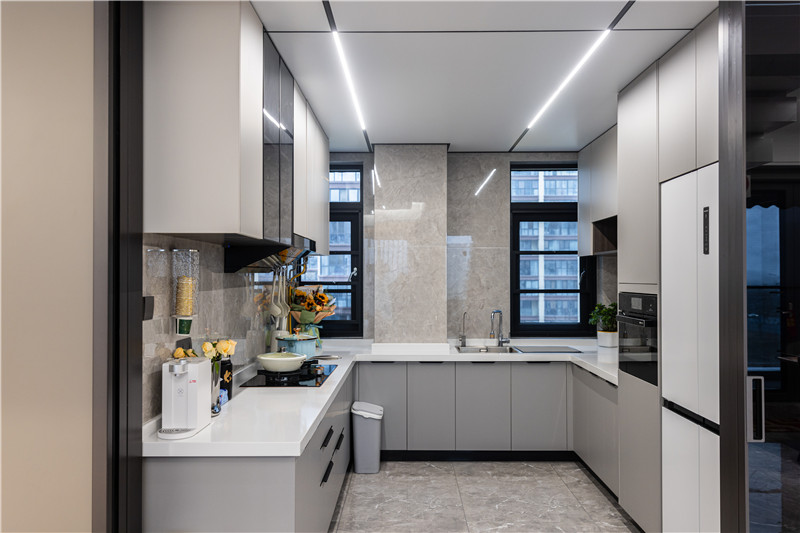 櫥柜以U型構造合理利用空間,其灰調與白調配合,簡約好看。洗→切→烹→盛的動線,提升美食烹飪的效率。