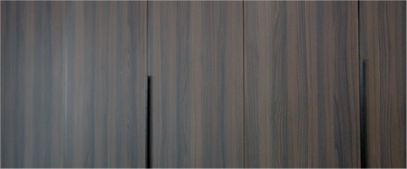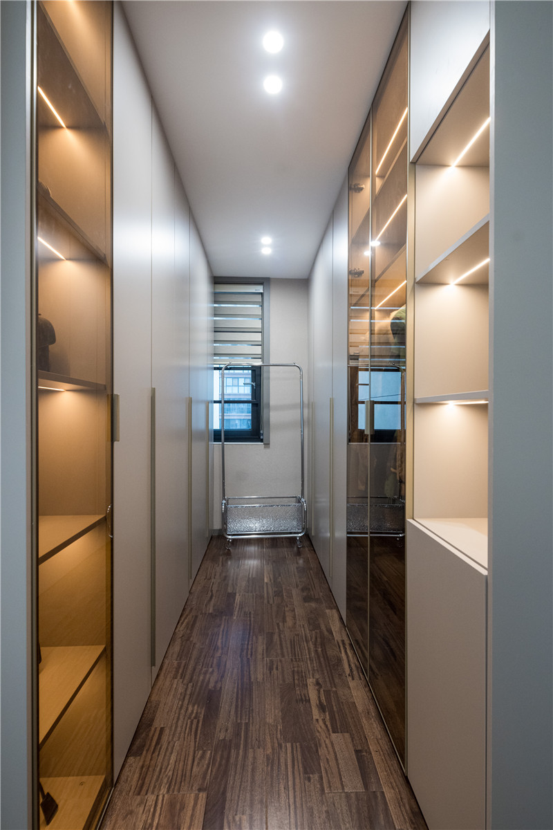 臥室側邊建立小型衣帽間,II型構造有效利用狹長區(qū)域,木柜、玻璃柜、展示柜組合,以藏八露二原則展現(xiàn)美感,其柜金屬色長短拉手配合,好看且具備實用性。