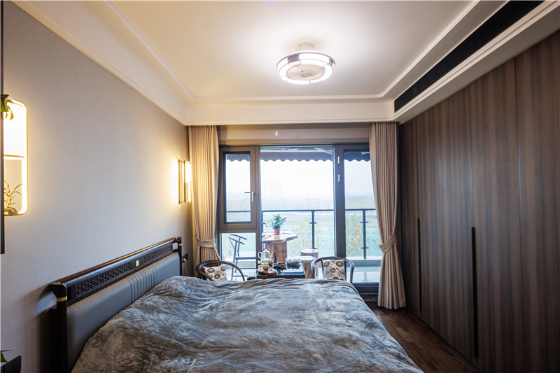 古典燈具+床頭板構造彰顯雅韻;獨立陽臺+配套茶桌椅,悠閑生活輕松實現(xiàn);一字型頂天立地式衣柜,以合理分區(qū)滿足屋主的多重收納需求。