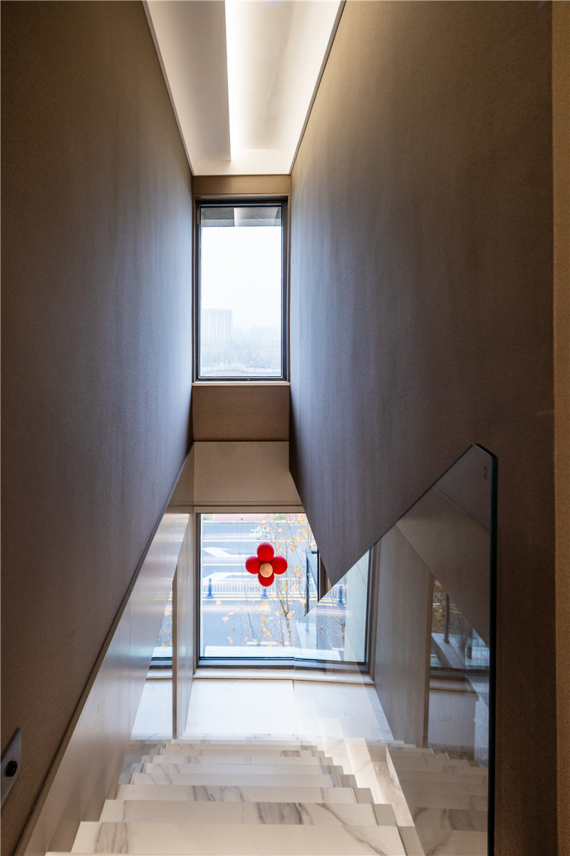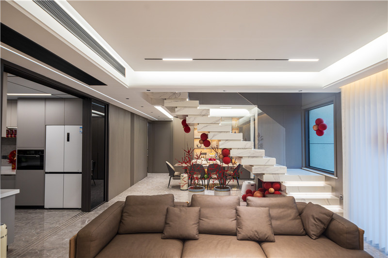 看完一樓的裝修,視線向上,高級特色的懸浮樓梯展大氣之勢,若三五好友來家小聚,拍照打卡地就有了。樓梯做簡單裝飾,下置用餐區(qū),氛圍感拿捏!