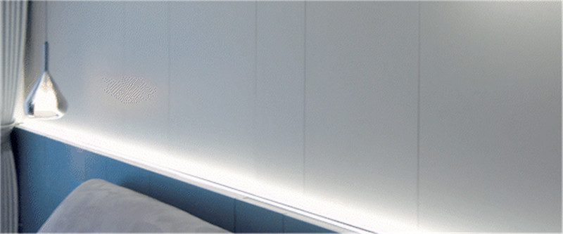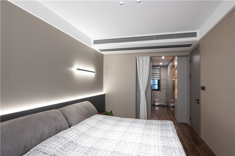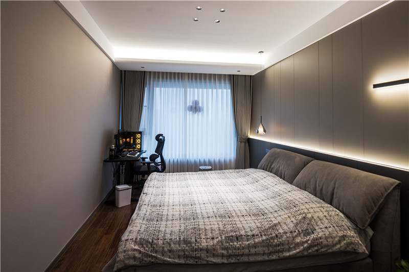 主臥床頭背景墻采用拼接設計,拼接處以燈光點綴,呼應于藝術燈及局部燈光,滿滿氛圍感。