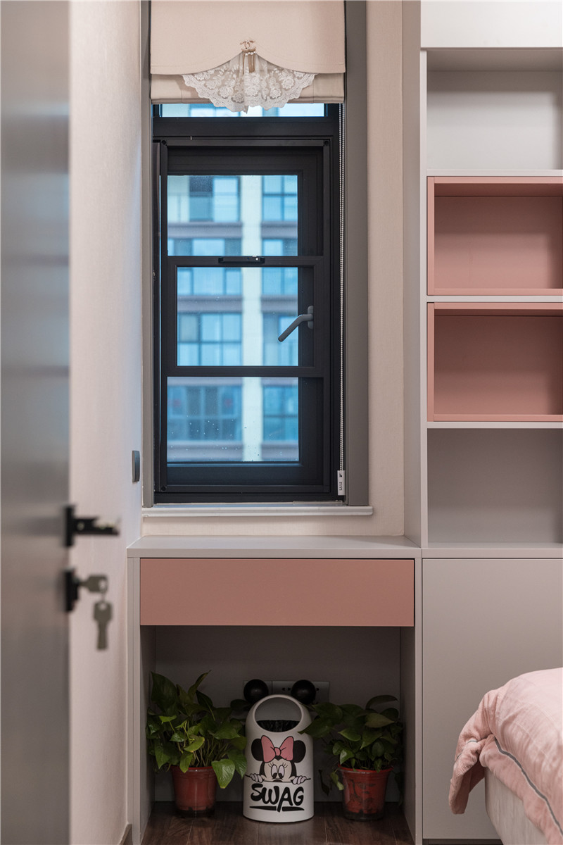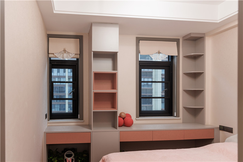 衣柜以霧霾粉作為跳色點綴,活潑靈動;靠墻圓弧展示柜,視覺柔和,是DIY區(qū),也是小物品收納區(qū);抽屜及底柜無拉手、桌面高度量身定制,空間利用率高。