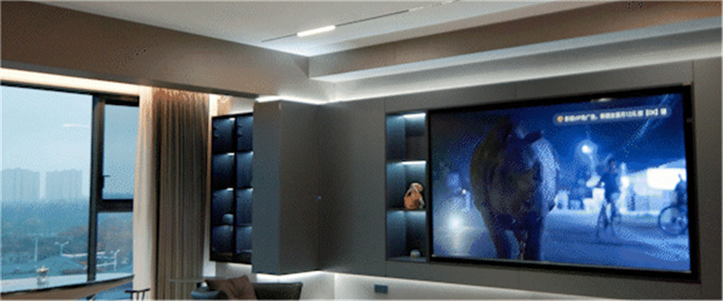 電視背景墻一體化設計,通過顏色穿插彰顯個性化;電視機嵌入柜體中,與裝飾隔層相協(xié)調,藏露結合;電視柜立體設計,墻內側嵌入燈光,以氛圍感突顯層次感。