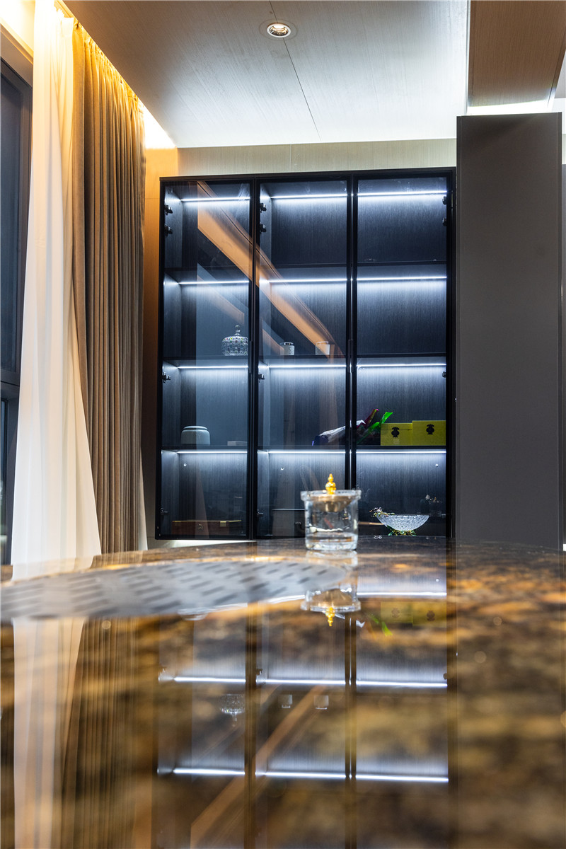餐桌雙圓弧造型,配合以整面餐邊柜(中部掏空且預留軌道插座),木與玻璃的組合將收納力有效保障。